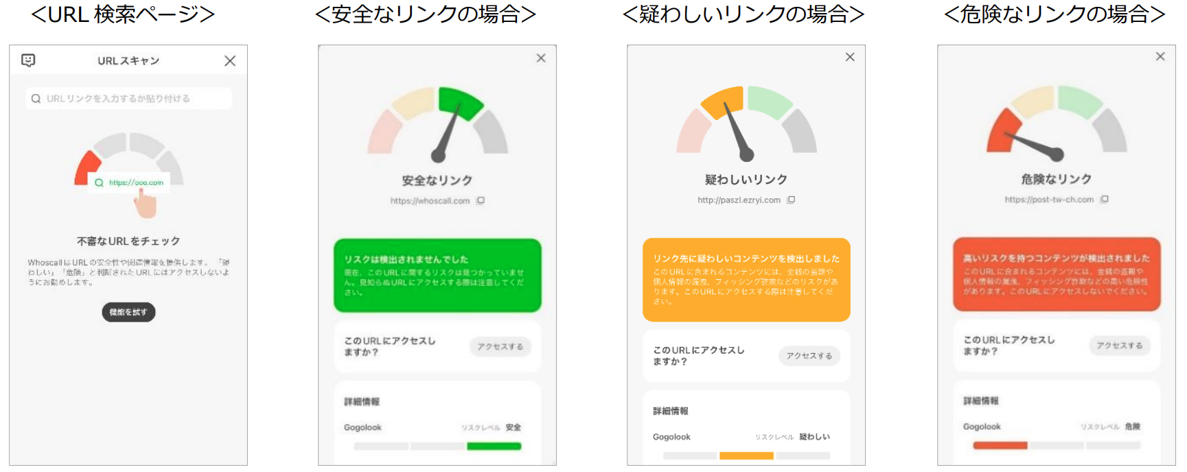 アプリ「Whoscall」を最新版にアップデートした後、アプリ内の「URLスキャン」をクリックし不審なURLを入力すると、「危険」「疑わしい」「安全」などリスクレベル別に結果が判定されます。リスクがあるウェブページと判定された場合、アクセスを防ぐためURLのクリックを避けるよう注意喚起を行います。