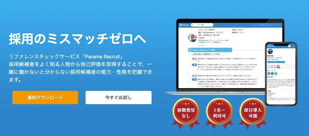 「Parame Recruit(パラミーリクルート)」はオンラインで完結するリファレンスチェック サービスです。採⽤候補者をよく知る⼈物から、⾯接だけでは知れない候補者の性格やスキル⾯、実績などの候補者の情報を取得し、採⽤のミスマッチリスクを最⼩化します。