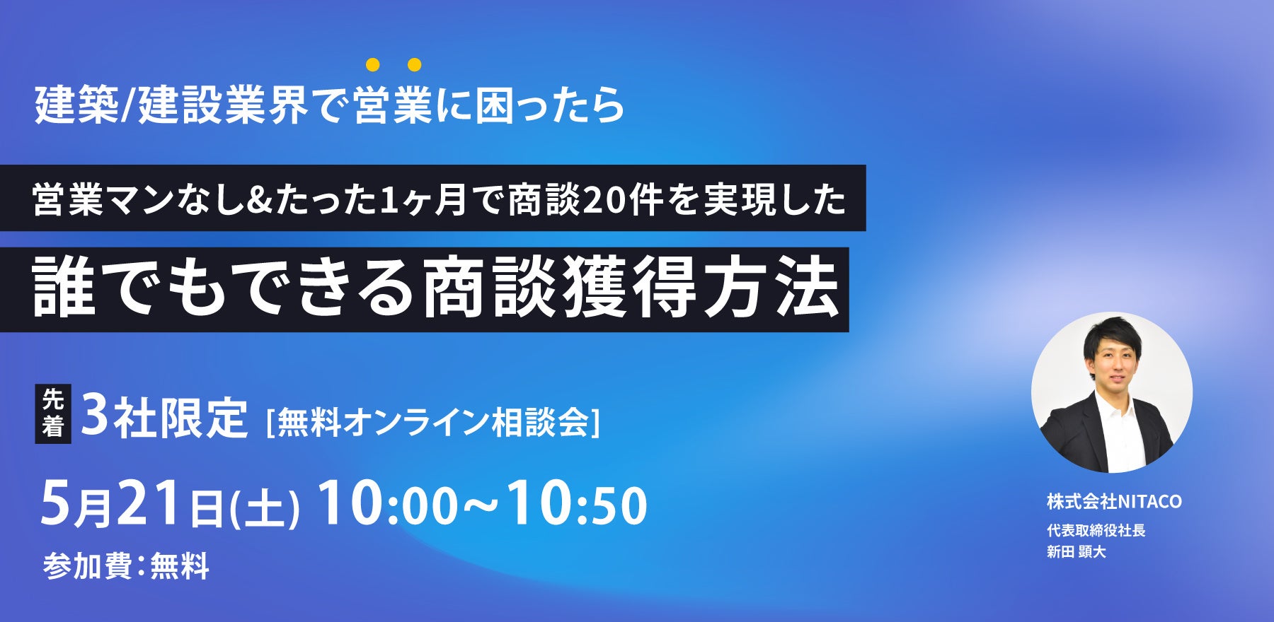 建築・建設業界向けの営業支援サービス「ツクルセールス」を提供する株式会社NITACO(本社:東京都渋谷区)はこの度、建築/建設行界向けの営業知見を元にしたウェブセミナー/相談会を実施することをお知らせいたします。
