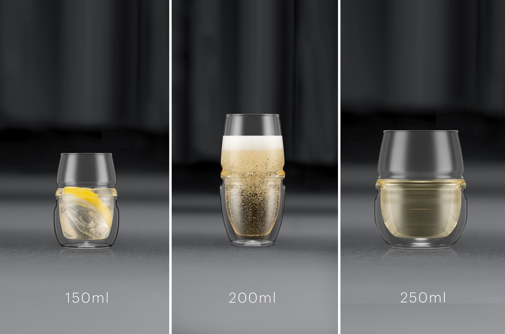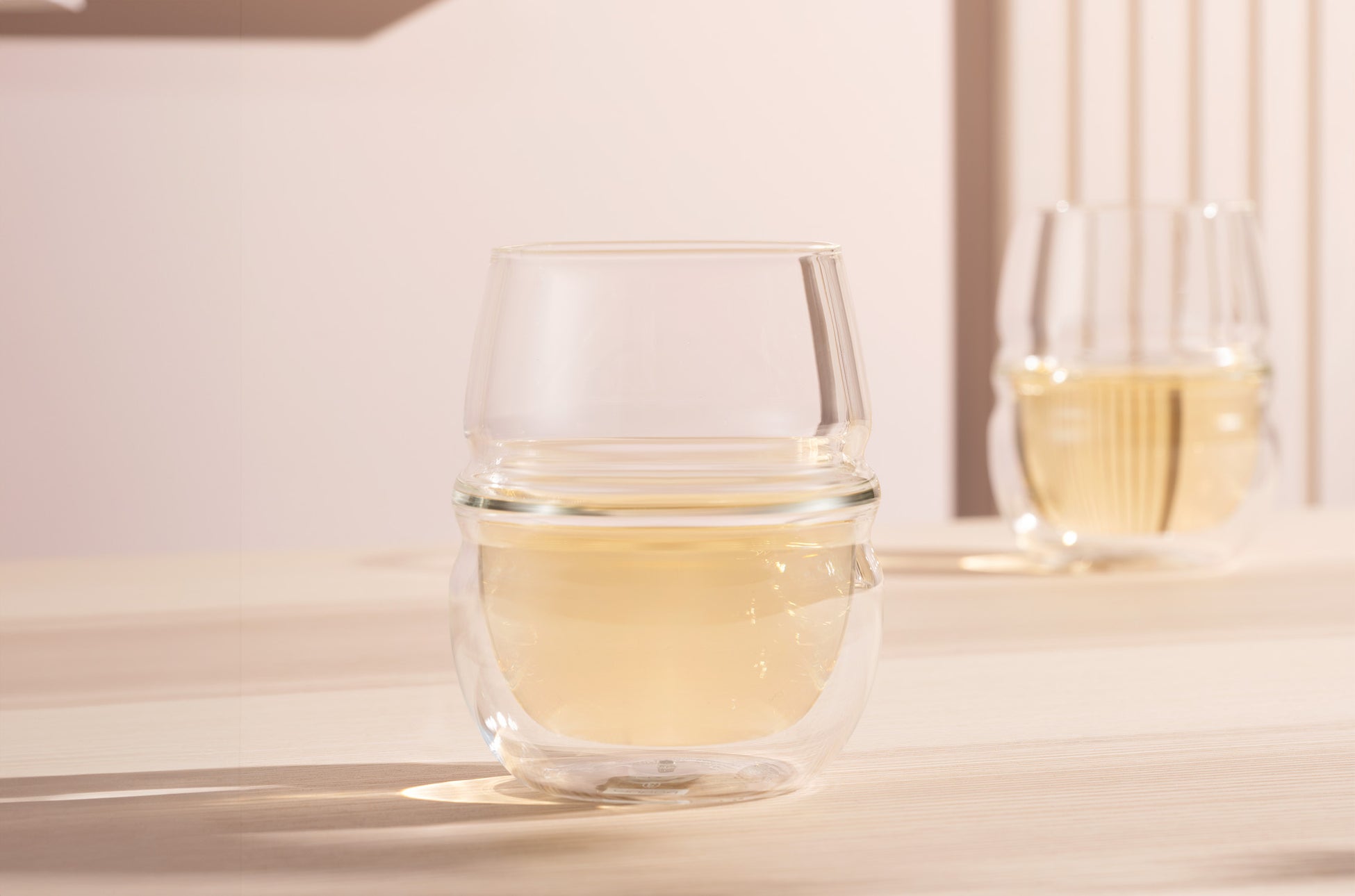 味覚・嗅覚・触覚が楽しめるシングルウォールと、保温・保冷性が高く結露しにくいダブルウォールの複合グラス。