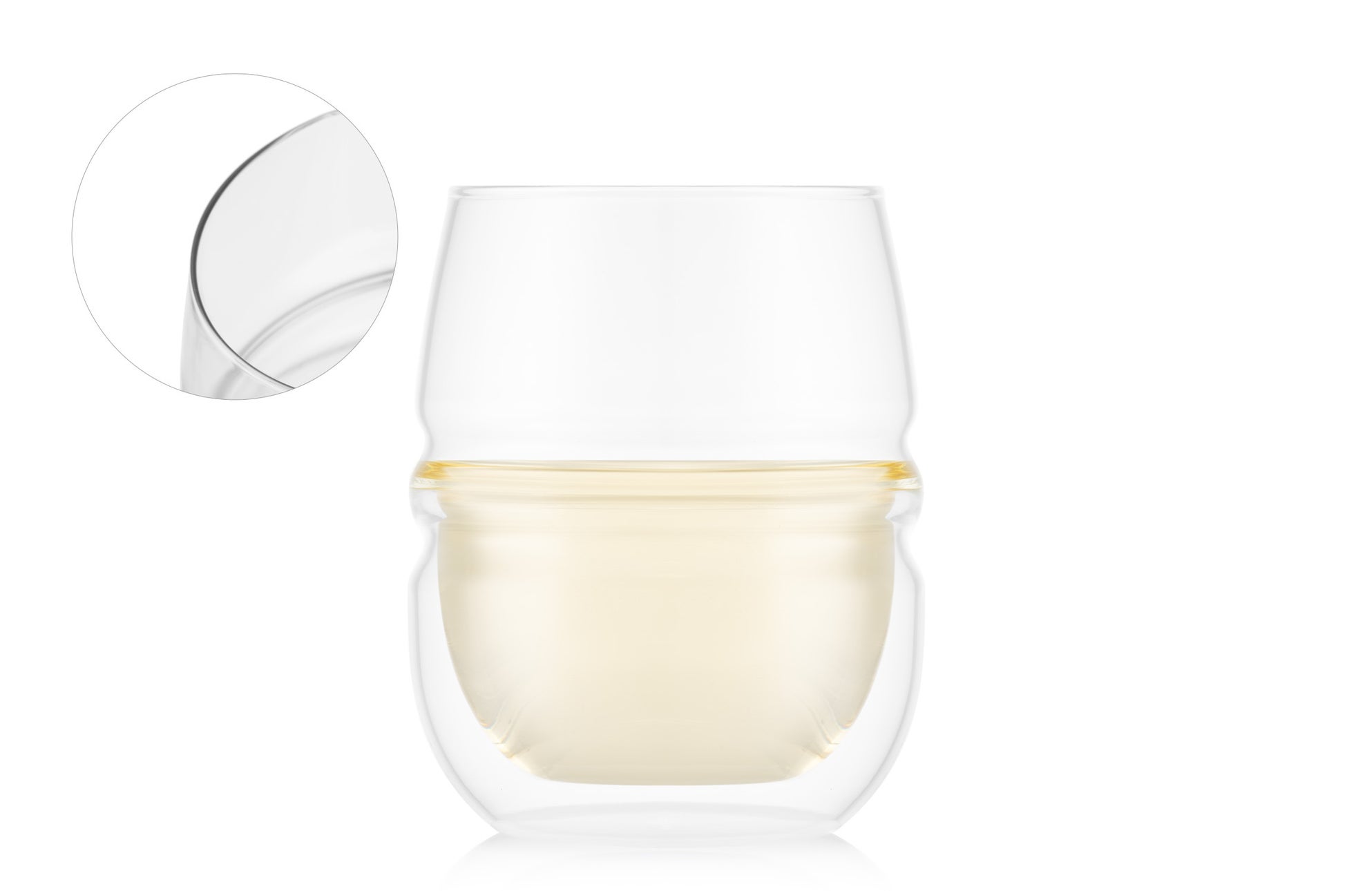 ダブルウォールアロマグラスの下半分は、従来のダブルウォールグラス同様、保温性が高く、温かい飲みものは温かく、冷たい飲みものは冷たく保ち、飲みもののおいしさを持続。