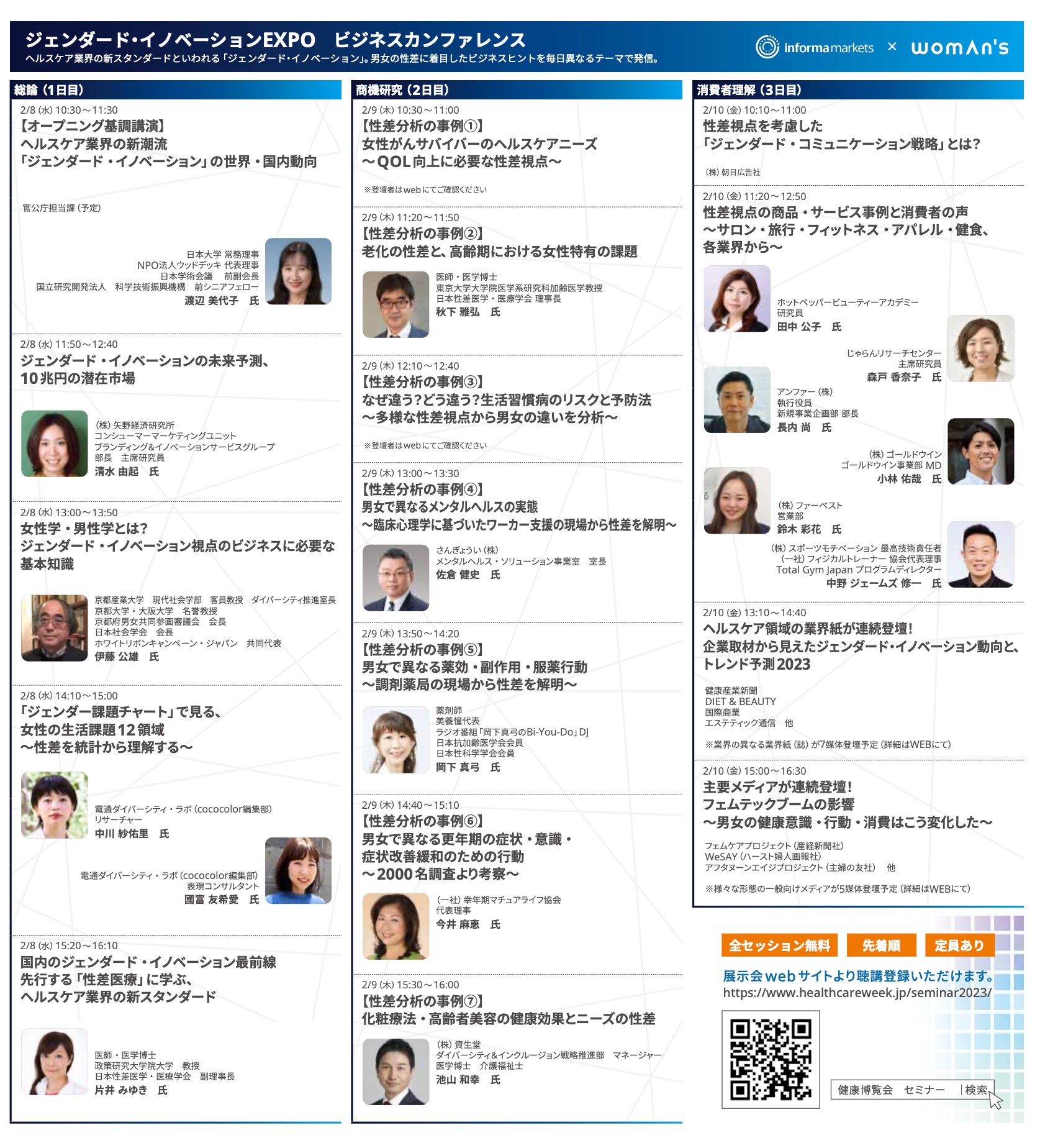 今後のヘルスケア業界でのスタンダードになっていくと言われている「ジェンダード・イノベーション(以降GI)」をテーマに、2023年2月8日~2月10日に「ジェンダード・イノベーション ビジネスカンファレンス」を開催します。「自社の製品・サービスに、どうGI発想を取り入れていけば良いの?」「産学官で盛り上がり始めているGI。今後の市場動向は?」など、ヘルスケア業界のビジネスパーソンがおさえておきたいセッションが満載です。GIをテーマにしたカンファレンスとしては国内最大級。医療/アカデミア/企業/メディアの各界から著名人が登壇し、GIに関する最新トレンド、事例、課題、指針などをオーディエンスに提供します。ヘルスケア業界における「ビジネスチャンス獲得」「ユーザー満足向上」「患者アウトカム向上」につなげていくための最先端の情報をインプットできる貴重な3日間です。性差分析に基づいた女性ヘルスケアソリューション/男性ヘルスケアソリューションの開発・販売を検討中の企業様、GI視点を医療の現場へ活かしたい医療関係者様、GIを研究領域としているアカデミア関係者様、フェムテックや性差に関する情報発信を強化しているメディア様など、ぜひご参加ください!