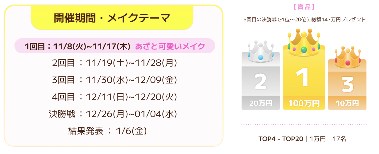 ②2ヶ月間で全5回テーマに沿ったメイクバトルを開催し、キャンペーンハッシュタグ#Make1upをつけてテーマに沿ったメイクを投稿すれば参加可能です!