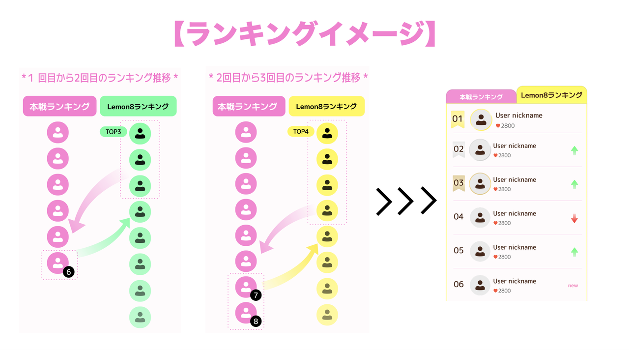 ③投稿のいいね数順にタイムリーなランキングを掲載し、毎回のテーマにおけるいいね数順で、「Lemon8ランキング」から「本戦ランキング」への昇格、「本戦ランキング」から「Lemon8ランキング」への降格の判断がなされます。