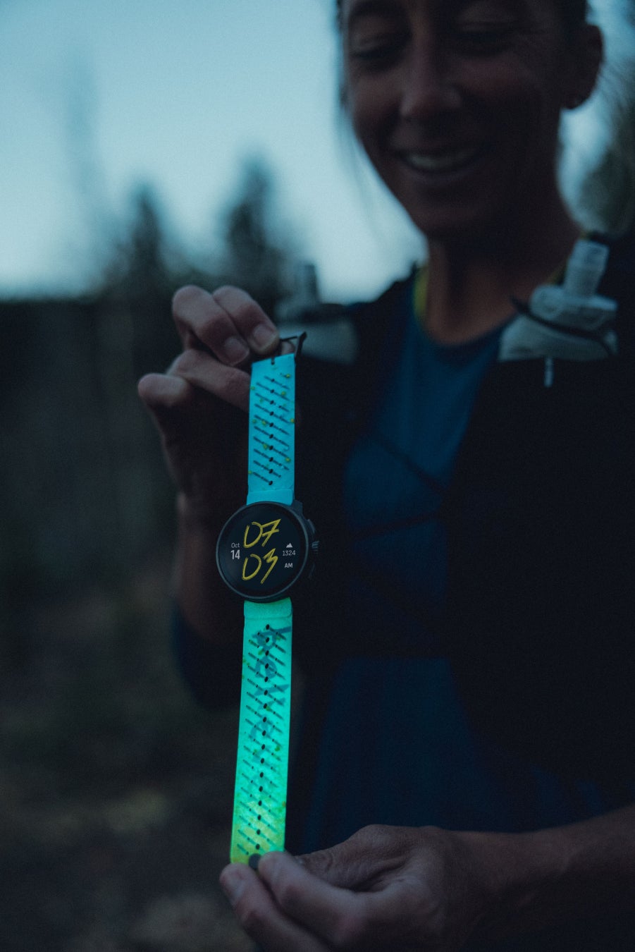 フルマラソンより長い距離を競うウルトラマラソンでは、夜の孤独な時間がとても辛いとされています。「SUUNTO RACE S Titanium Courtney」はバンドに蓄光素材を使用することで、暗くなった時にバンドが光り、コートニーのモットーである“Believe”(信じる)が浮かび上がります。