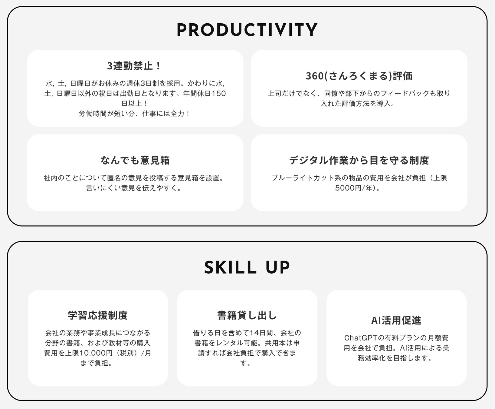 「&BOX」 では、すべての福利厚生制度を「生産性(Productivity)」、「スキルアップ(Skill Up)」、「コミュニケーション(Communication)」、「プライベート(Private)」、および「一般(General)」の5つのカテゴリーに分けています。今後はこれらの各カテゴリーをバランスよく強化し、全従業員が適切な休息を取り、リフレッシュされた状態で仕事をするための福利厚生のさらなる拡充に努めてまいります。
