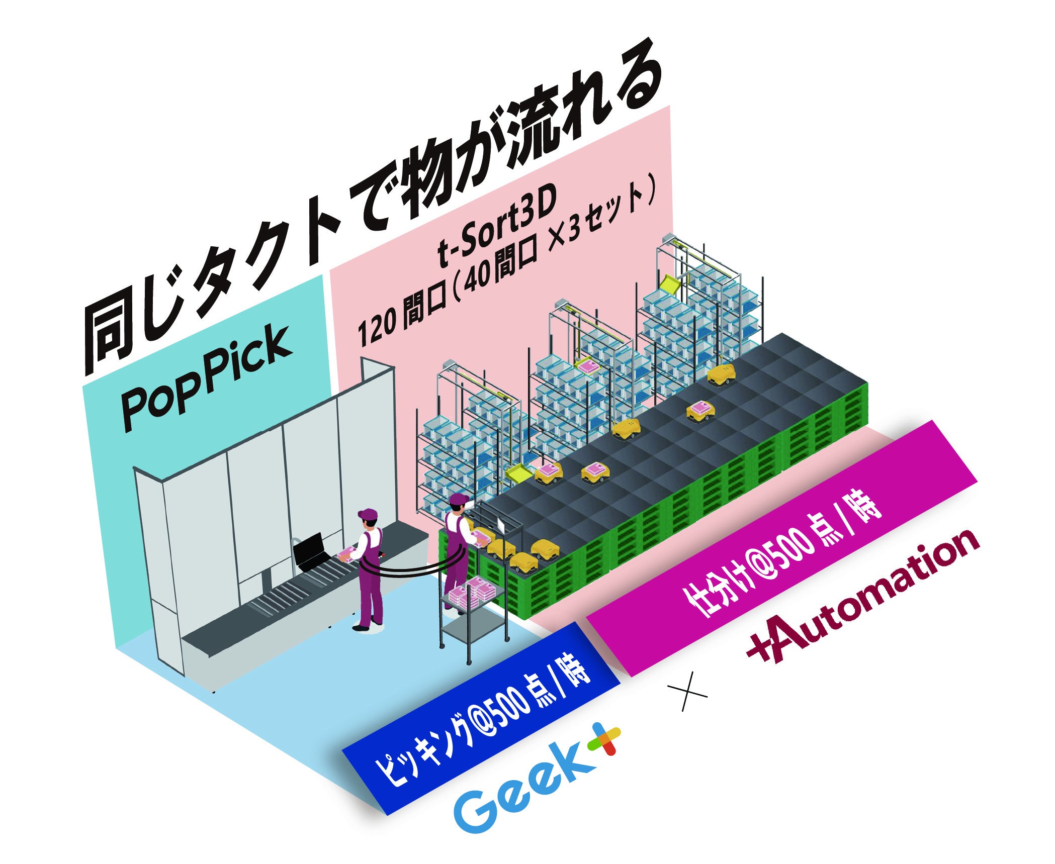 新型棚搬送型ロボット「PopPick」とロボットソーター「t-Sort 3D」との相互連携で、お客様の多様なニーズに対応出来る物流ソリューションを構築