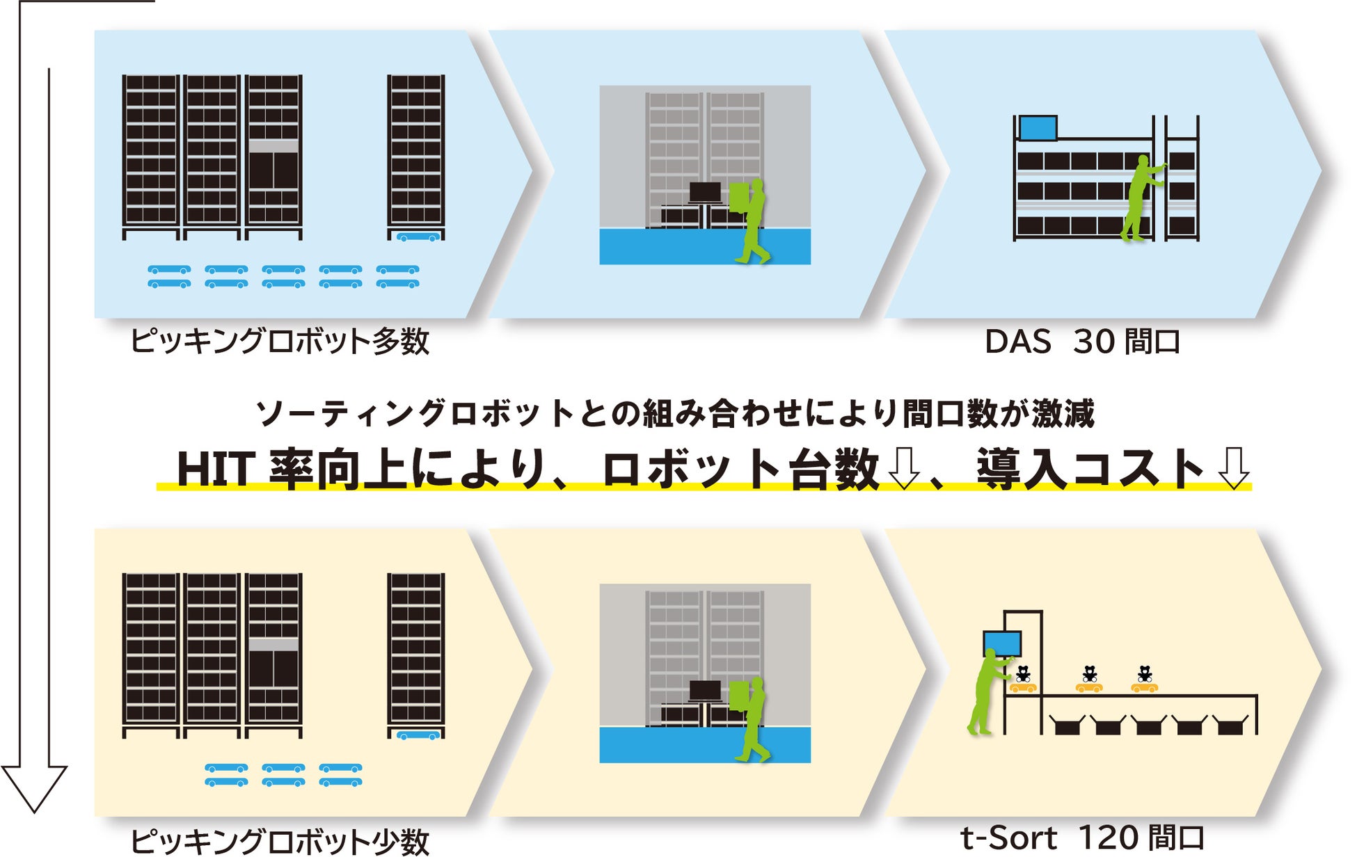 一番効果的でわかりやすいメリットは、導入コストの削減です。EVEによって運ばれてくる1つの棚から、どれだけの商品をピック出来たかを示す値を「ヒット率」と呼び、EVEの効率性の大きな指標となります。この数値が高まれば、同一の出荷キャパシティを設計する際、ロボットの台数を逓減し、初期投資額を抑えることが可能です。ヒット率を高めるために、仕分け用のDAS(Digital Assort System)の間口数の増加させることが有効ですが、増加させるにつれ、逆に棚から商品をピックし、それをDASに仕分けるピッカーの作業効率が下がるという傾向に陥ってしまいます。よって、DASは多くても30間口程度までが限界でした。しかし、「t-Sort3D」をDASの代わりに連携することで、仕分け間口を大幅に増やし、ピッキング時に1つの棚からピッキングできるヒット率(商品数)を大幅に増やすことができます。これにより作業生産性が上がるのと同時に、必要になるEVEの数が抑えられ導入コスト削減に繋がります。