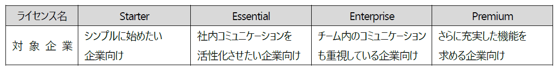 今回、販売を開始する新バージョン(バージョン2.0)では、多様化するお客さまのニーズに対応すべく、「Starter」、「Essential」、「Enterprise」、「Premium」の4つのライセンスを用意しました。お客さまが抱える課題に合わせてライセンスを選択いただくことで、お客さまがめざす企業像の実現をサポートします。