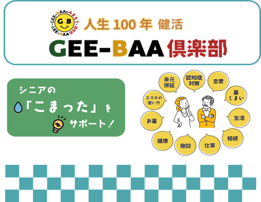 さらに「GEE-BAAのあんしん」サービスで身元保証、生前葬・お墓あんしん、相続・生前整理など終活の悩みもまるっと解消いたします。外出が困難なシニアの方にはハートフルネス事業で培った寺院連携「法要三昧」というオンラインで月例法要に参加できるサービスやハートフルネスアプリ「ポケットメモリーズ」でメタバースのお墓、仏壇にお参りができ、シニアのメンタルケアや日々の安らぎにつながるサービスをご利用いただけます。