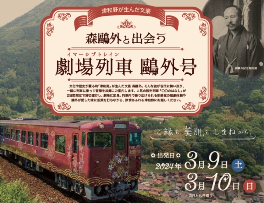 津和野が生んだ文豪 森鷗外。そんな彼が現代に舞い戻り、一緒に列車に乗って皆様を故郷にご案内します。新山口駅から津和野駅に向かう人気の観光列車「〇〇のはなし」を2日間限定で貸切運行し、列車が劇場となる新感覚の観劇体験をお楽しみいただけます。