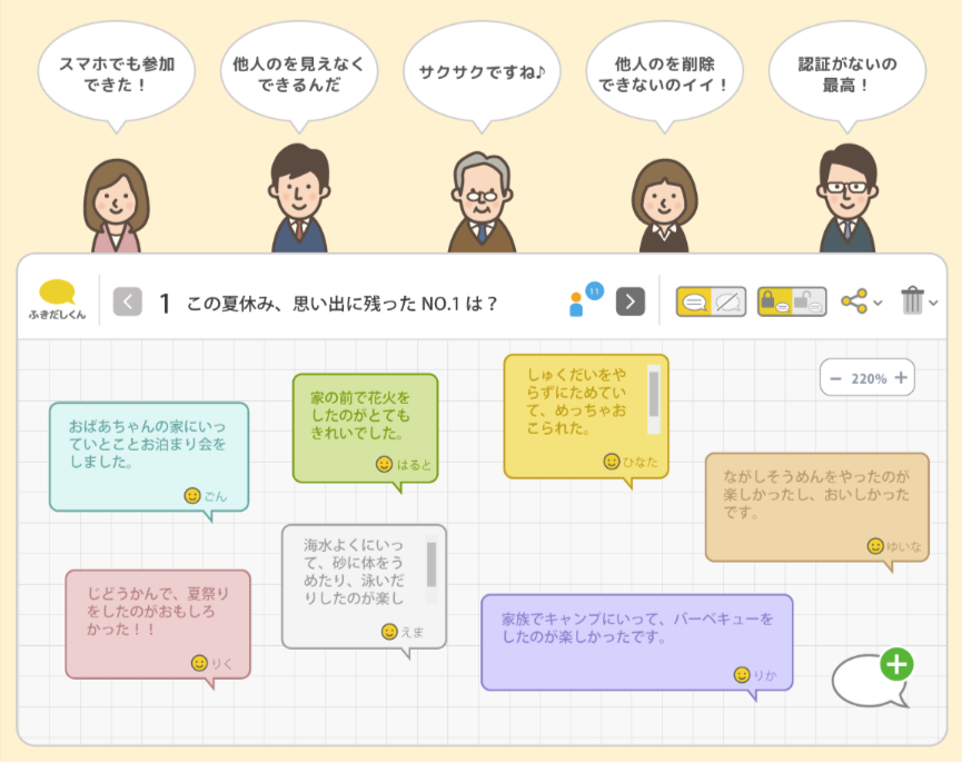 『ふきだしくん』は、授業中に生徒の意見を一斉に可視化できる付箋ツールです。ログイン不要・アプリのインストール不要で、誰でも簡単に使えます。