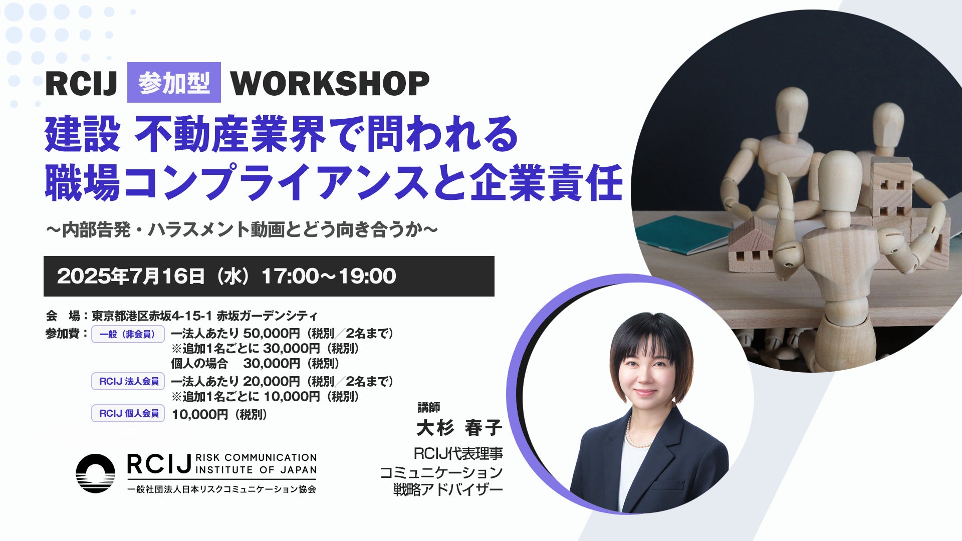 日本で唯一のコミュニケーション戦略におけるリスク管理に特化したカリキュラムを展開する一般社団法人 日本リスクコミュニケーション協会(略称:RCIJ、代表理事:大杉春子)は、7月16日(水)に建設・不動産業界の管理職を対象としたリアルワークショップ『建設・不動産業界で問われる職場コンプライアンスと企業責任』を開催します。