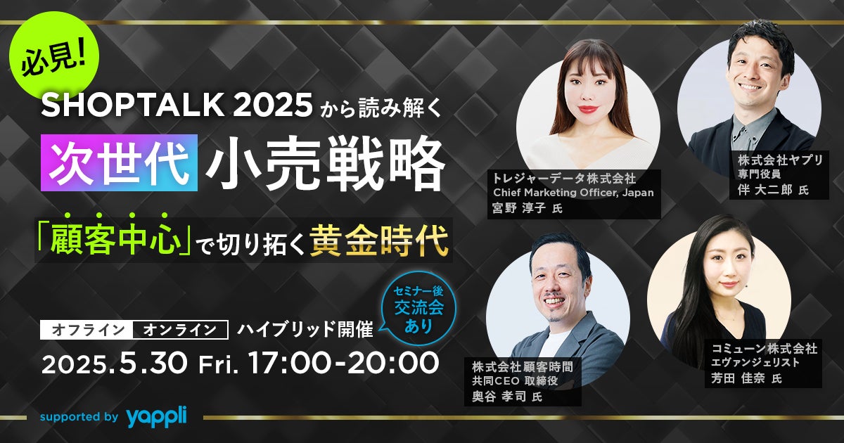 株式会社顧客時間、株式会社ヤプリ、コミューン株式会社、トレジャーデータ株式会社は、2025年3月にアメリカ・ラスベガスで開催された小売・ブランド向け世界最大級のカンファレンス「SHOPTALK 2025」について、現地で発信された最新情報を中心に、開催報告イベントを下記の通り共催いたします。