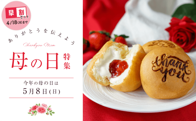 今年新発売した特許取得機械で焼き上げる「ハート形のバームクーヘン」や、定番のくりーむパン カスタード味に焼印を施した「Thank youくりーむパン」等、見た目からもありがとうの気持ちが伝わる商品を含むセットや、様々な商品をご家族皆様でお楽しみいただけるバラエティーセットをご用意しました。また、母の日より少し前の4月末のお届けで、お得な料金でご購入いただける「早期出荷割引」もご用意しております。八天堂母の日ギフトで絆が深まる美味しいひとときをお過ごしください。