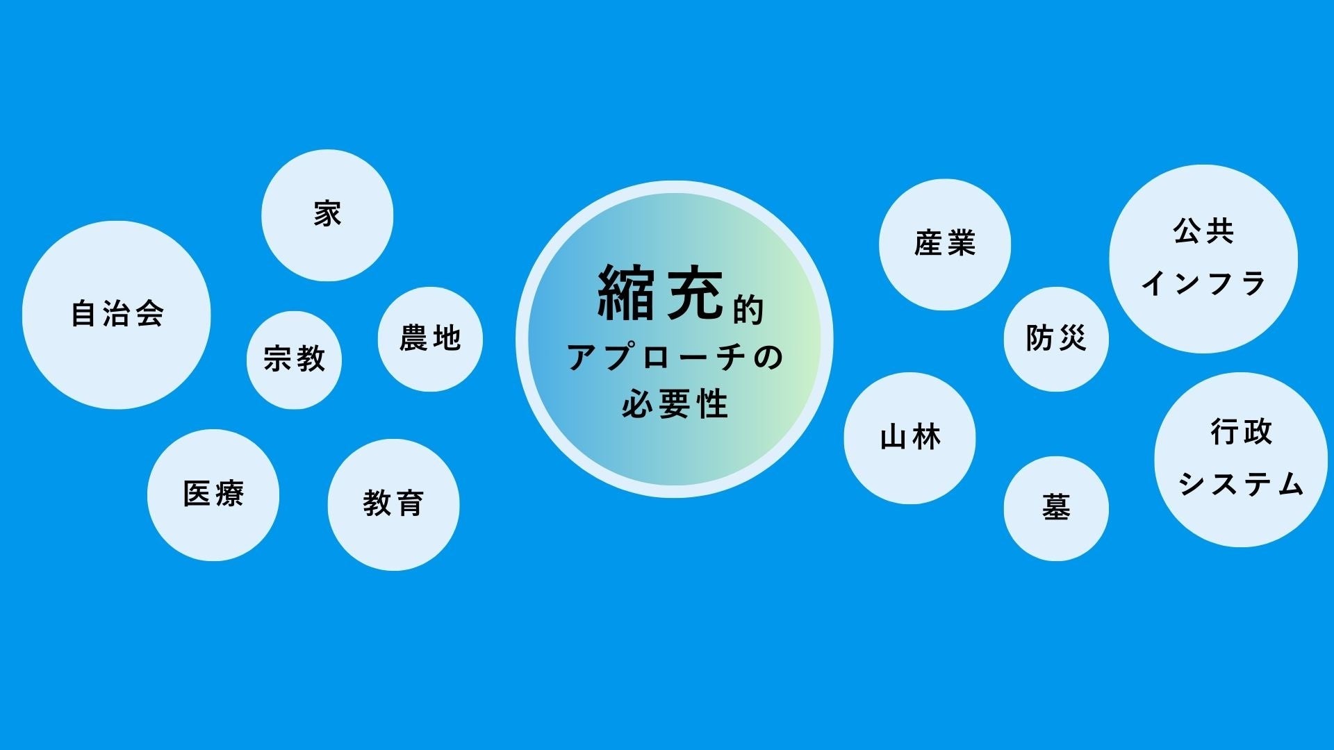 空き家、山林、農地、教育、公共施設、地域経済など、個別領域を超えた横断的視点で課題を捉える。