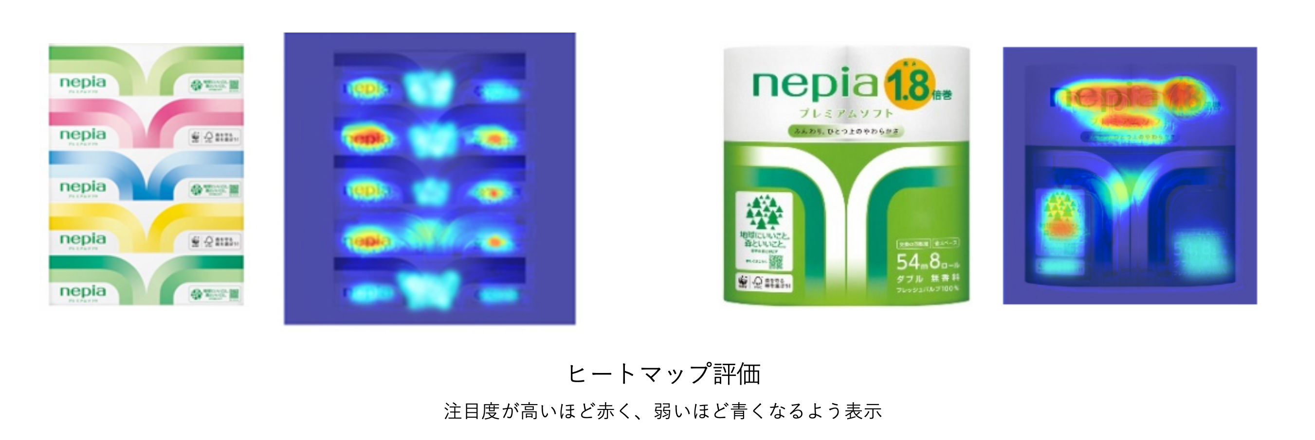 今回、当社として初の試みとなる株式会社プラグ(本社:東京都千代田区 代表取締役社長:小川亮)が提供するAIによるパッケージデザイン評価システム『パッケージデザインAI』を採用しました。AIによるパッケージデザイン評価で測定した結果、リニューアル後のパッケージデザインは現行品のパッケージデザインと比較し、20代~50代女性の好意度が10%※2向上いたしました。注目箇所を可視化したヒートマップ評価では、「ネピア+商品名」と「ネピア環境マーク」が視認されていることがわかります。