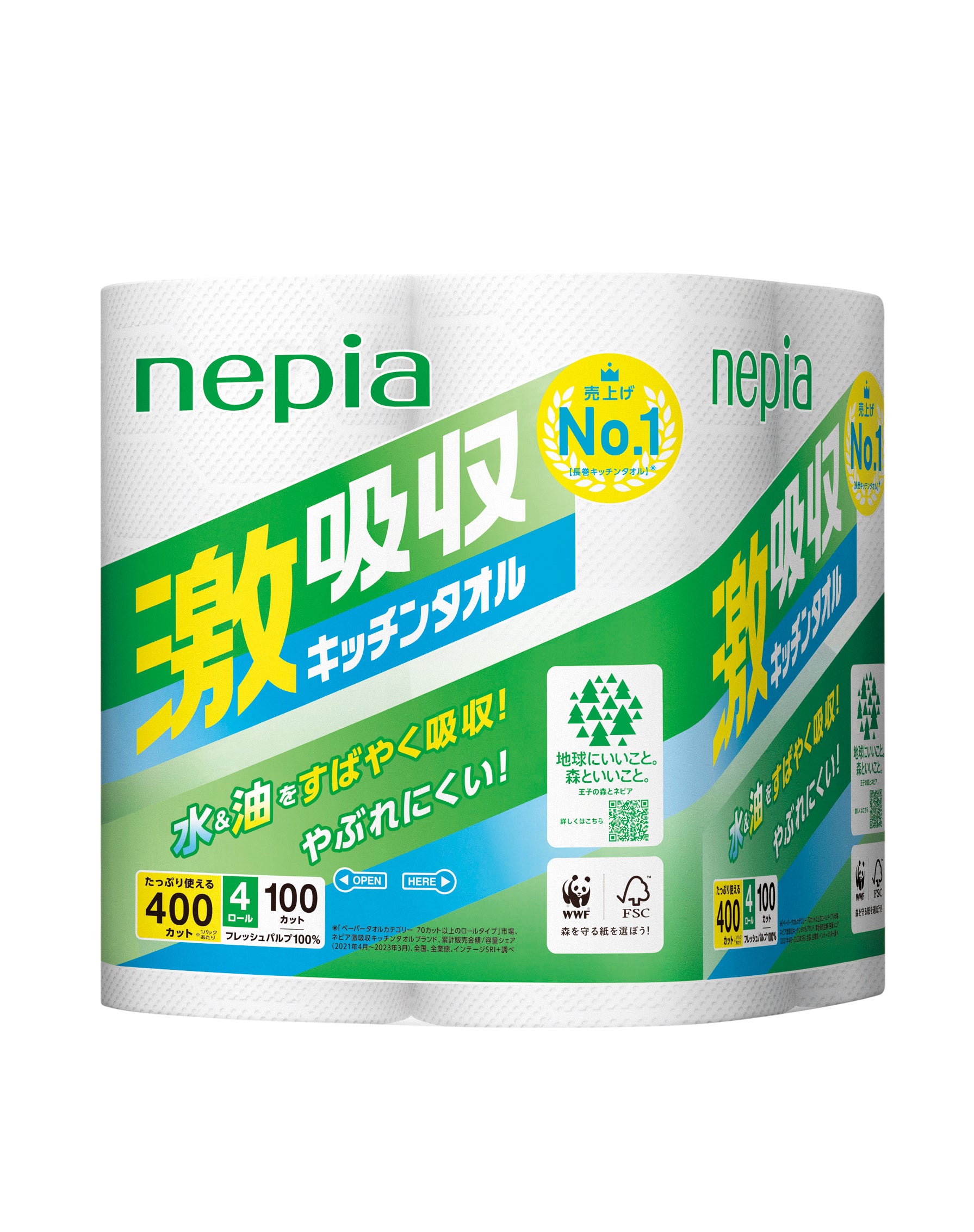 ※1: 「ペーパータオルカテゴリー70カット以上のロールタイプ」市場、ネピア激吸収キッチンタオルブランド、累計販売金額/容量シェア(2021年4月~2023年3月)、全国、全業態、インテージSRI+調べ