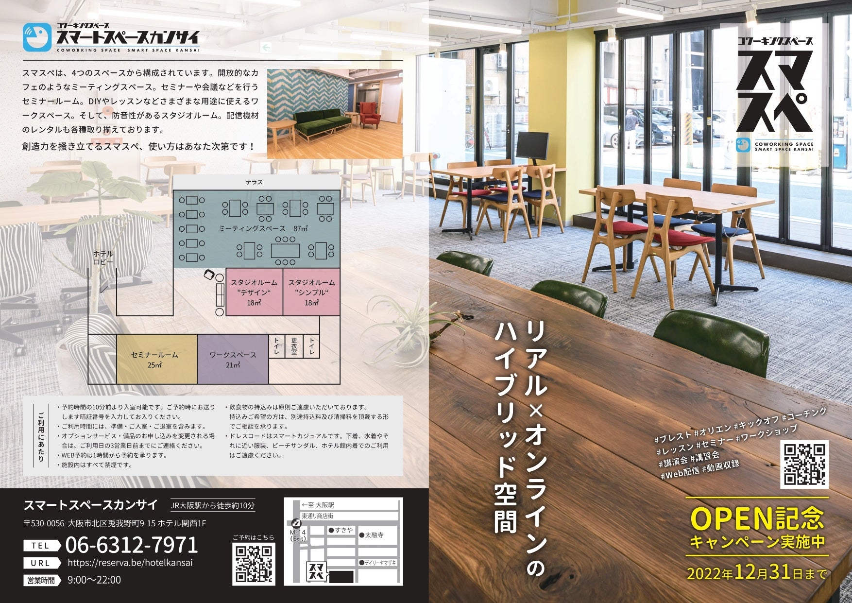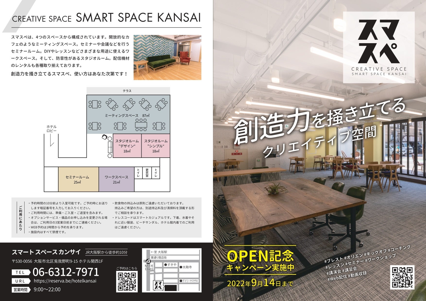 JR大阪駅より徒歩10分の便利なホテル、 ホテル関西(所在地:大阪府大阪市北区兎我野町9-15)が館内リニューアルを行いました。そして、 7月15日よりホテル関西内にコワーキングスペース「スマート・スペース・カンサイ(スマスぺ)」をプレオープンしました。プレオープン記念キャンペーン中、打合せスペースが250円/15分(1テーブル) と通常価格の半額でご使用できます。【2022/12/31(土)まで】 スマスペHP:https://www.hotel-kansai.co.jp/coworking-space