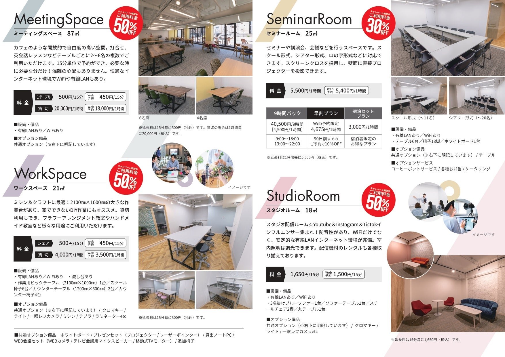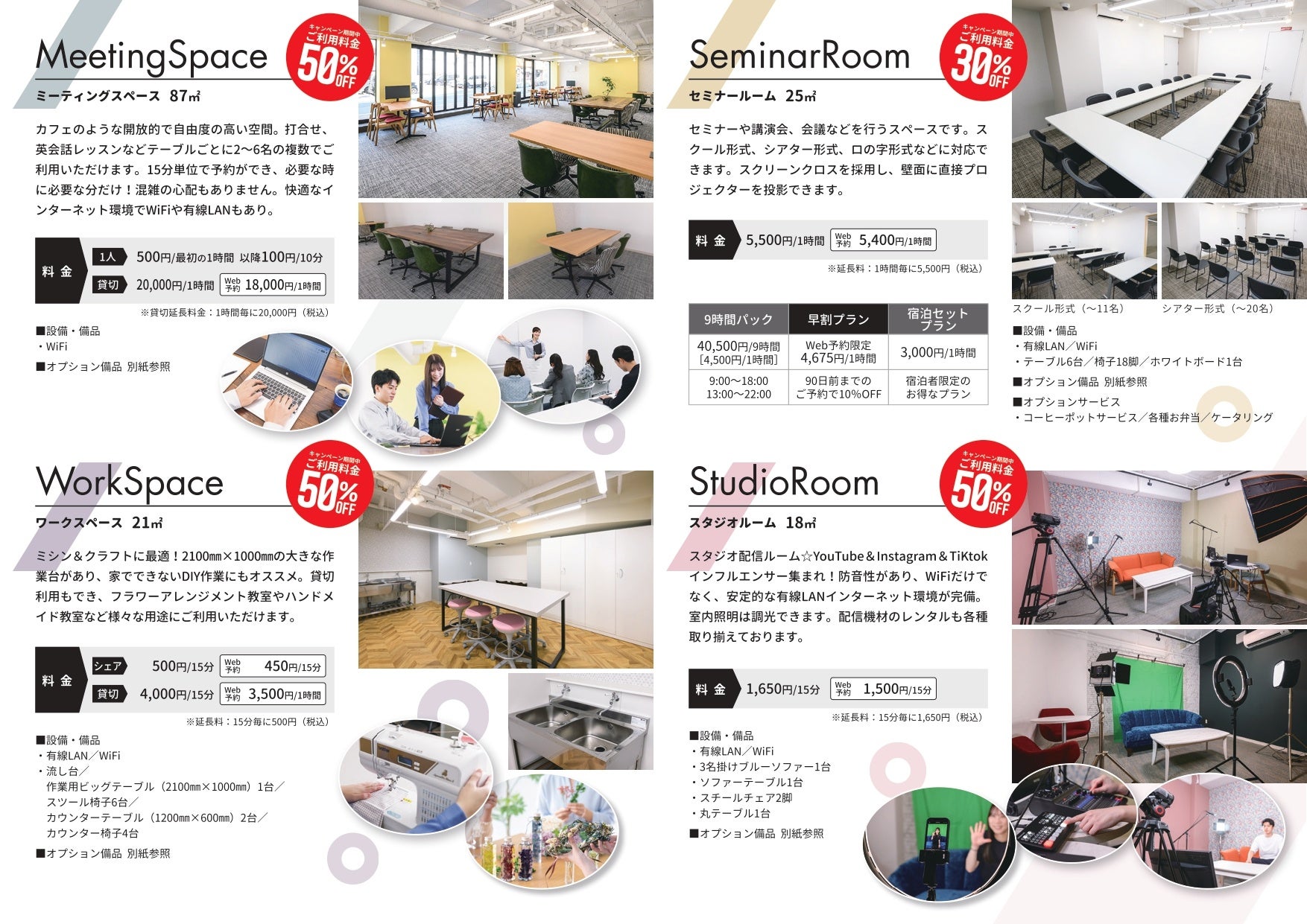 セミナールームの場合 ▶フロント価格5,500円/時 WEB予約5,400円/時