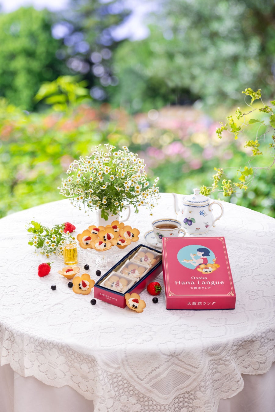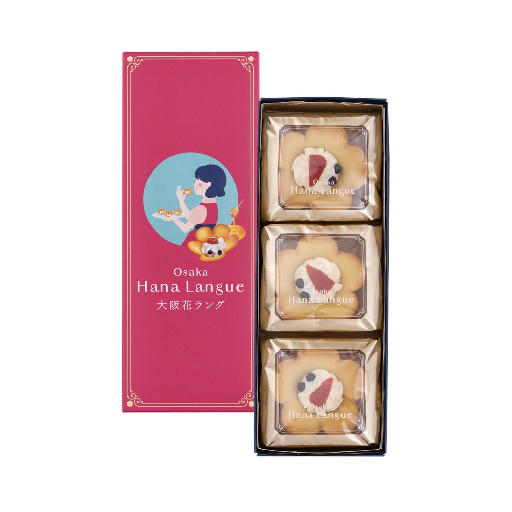 「大阪花ラング」は、見て可愛い、食べておいしい、お花のカタチのラングドシャです。「このお菓子を贈られた人の人生に、色とりどりの花が、たくさん咲きますように…」という想いを込めて、2019年に発売しました。