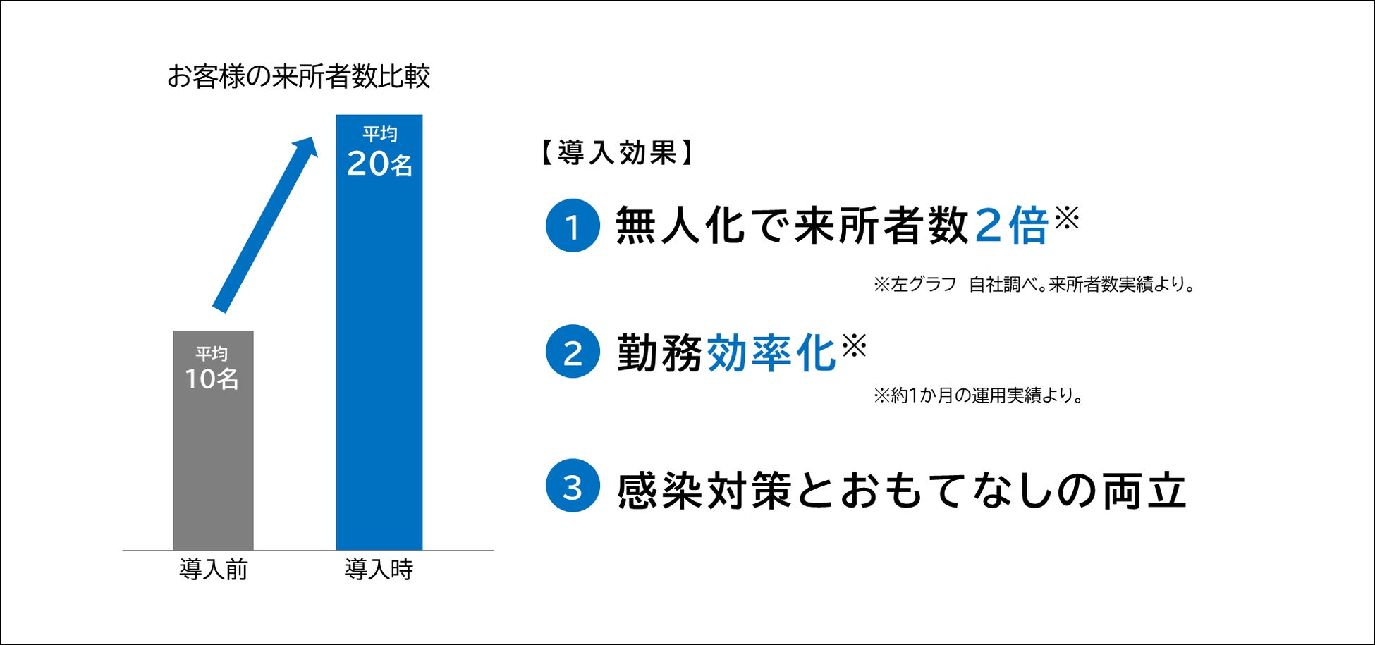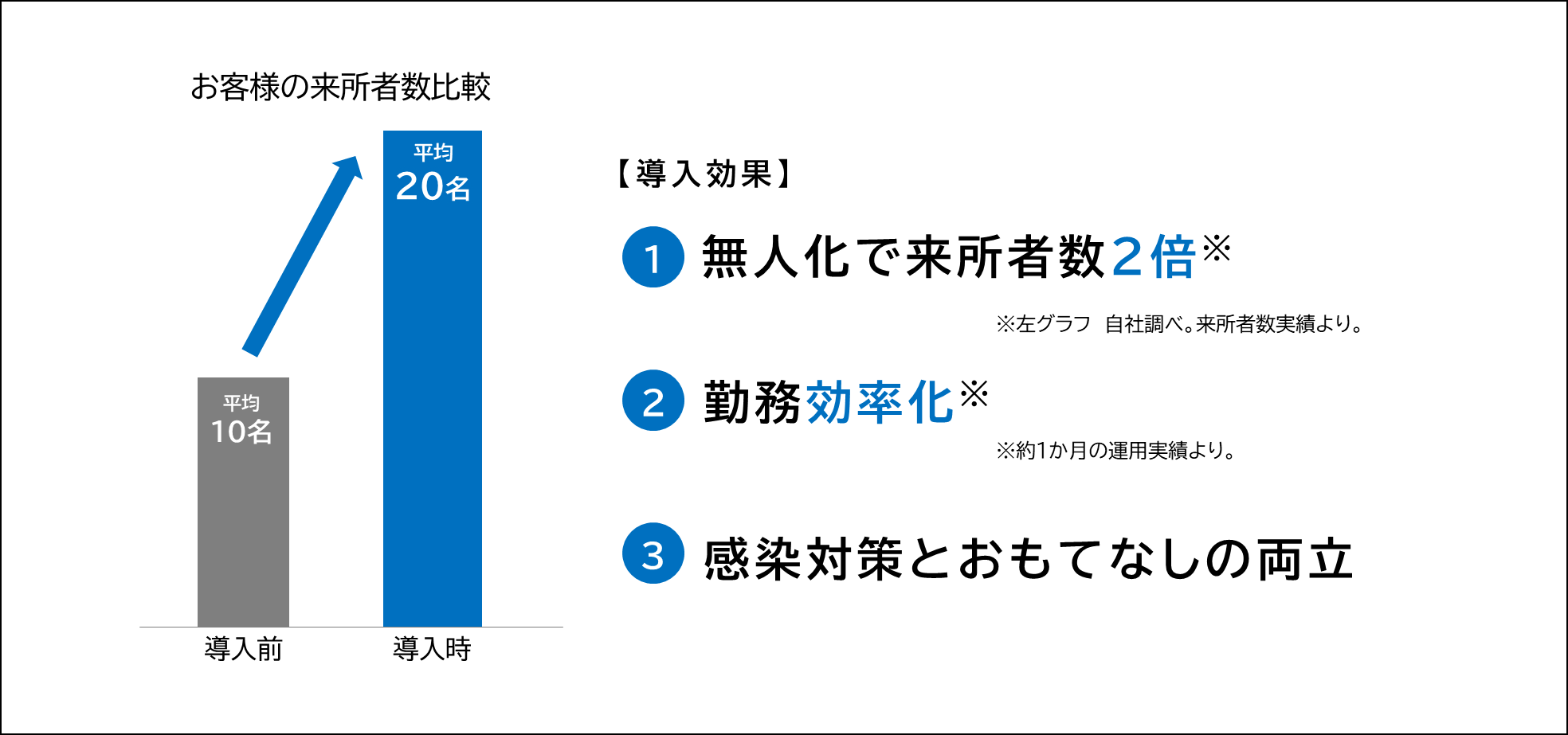 無人案内所として運営することにより、これまで1日約10名の来所者数が、約20名と2倍に増加しました。
