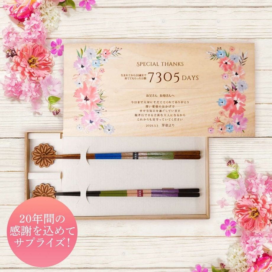 感謝状にはかかせない「カウント数字」や「メッセージ」が入る仕様はそのままに、普段使いしやすい夫婦箸と箸置きを特別な桐箱にセットしてプレゼントしていただけます。