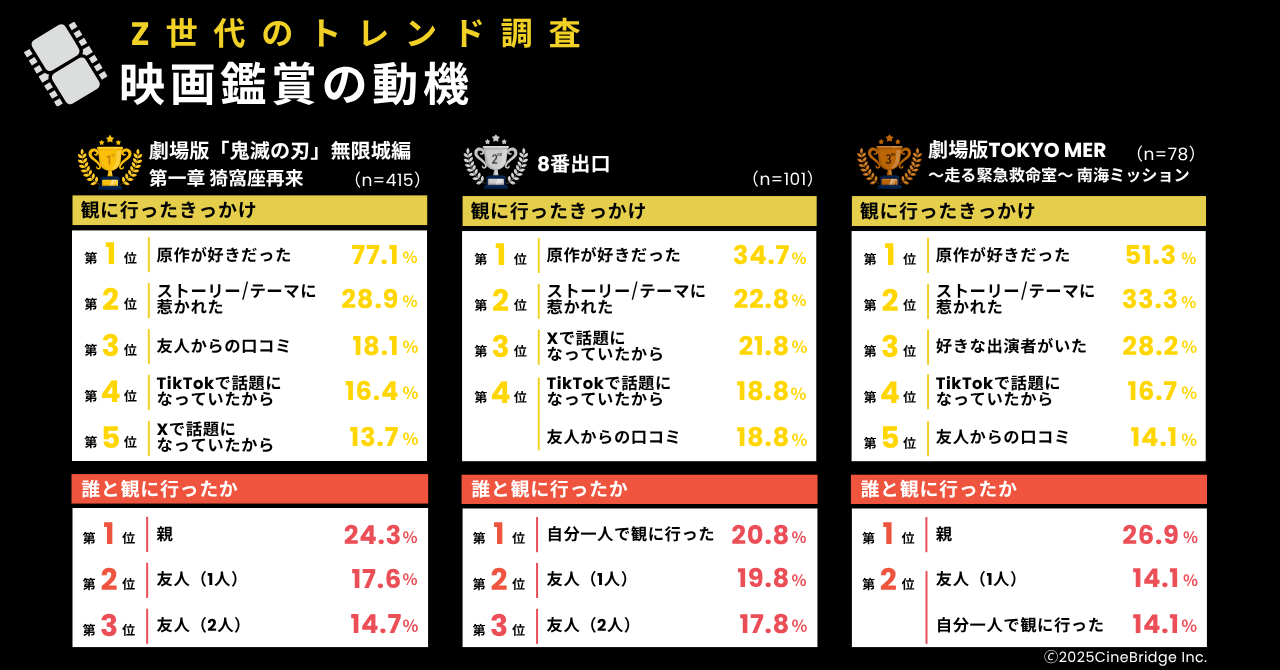 さらに、鑑賞者の半数近くが「友人」と共に鑑賞しており(『鬼滅の刃』52.8%、『8番出口』50.4%、『TOKYO MER』33.4%)、友人との話題共有も映画館での鑑賞に不可欠な要素と言えるでしょう。