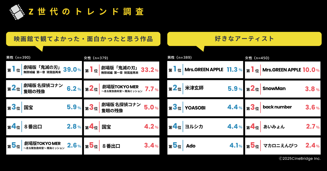 男女ともに「観て良かった映画」は『鬼滅の刃』が1位となり、『国宝』などのヒット作も上位にランクイン。好きなアーティストでは、前回調査に続き男女ともに「Mrs. GREEN APPLE」が1位となった。