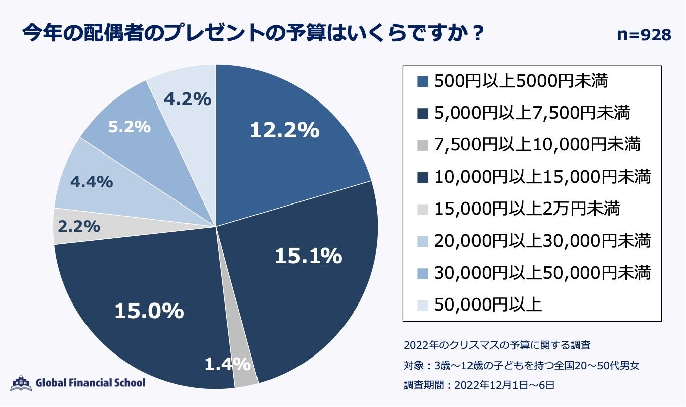 価格帯では、クリスマスケーキは「3,000円以上5,000円未満」が、子どものプレゼントでは「5,000円以上7,500円未満」が、そして配偶者のプレゼントでは「5,000円以上7,500円未満」と「10,000円以上15,000円未満」がほぼ同じポイントで一番多いという結果となりました。