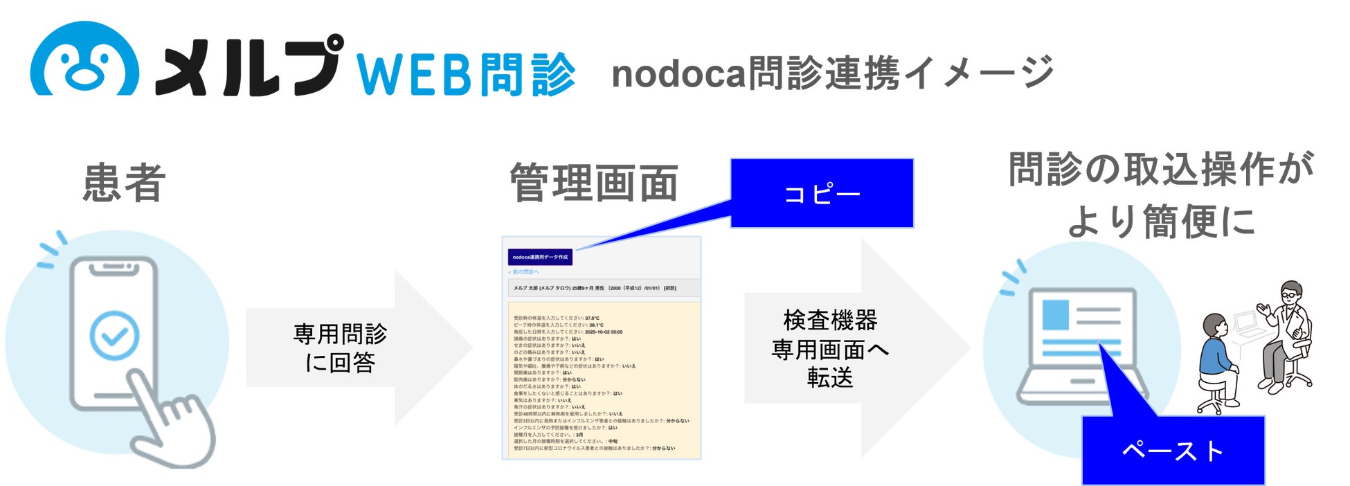 2024年11月に公開した“アイリス専用問診”(掲載元:https://hyakka.melp.life/)を、メルプWEB問診の管理画面からワンクリックでコピーし、nodocaクラウド画面内で簡単にペーストすることで問診取り込みの利便性が向上しました。従来、来院後ないし検査直前に口頭や紙を用いて取得していた問診情報を、来院前に取得できるようになり、さらに問診の取り込みがスムーズに行えることにより、検査から診断までの時間短縮や効率化に繋がります。今後は、メルプWEB問診に加えて、新しくリリース予定の”新”WEB問診システムにおいても同様の連携を進めて参ります。