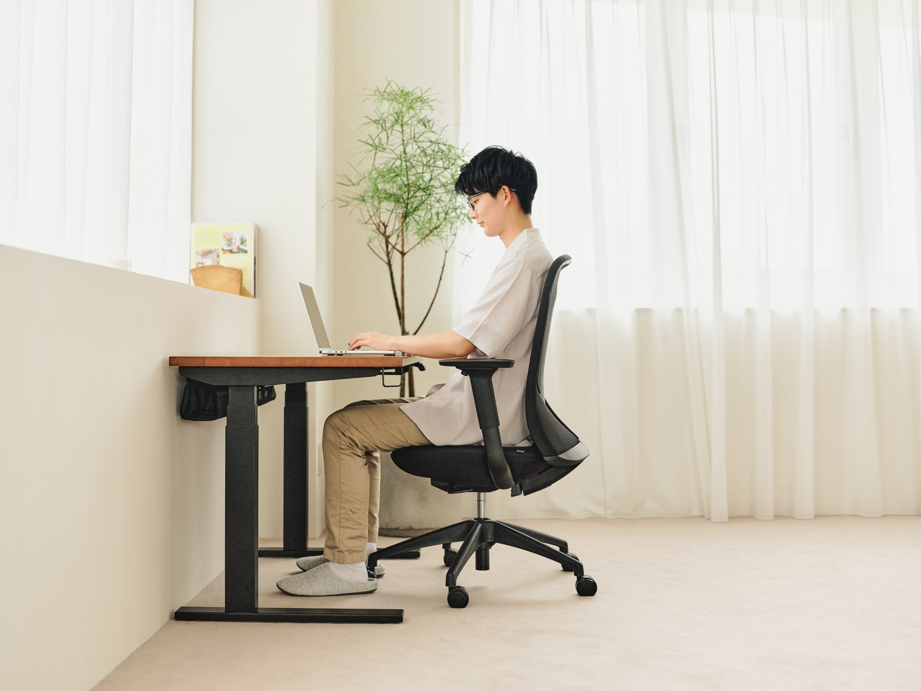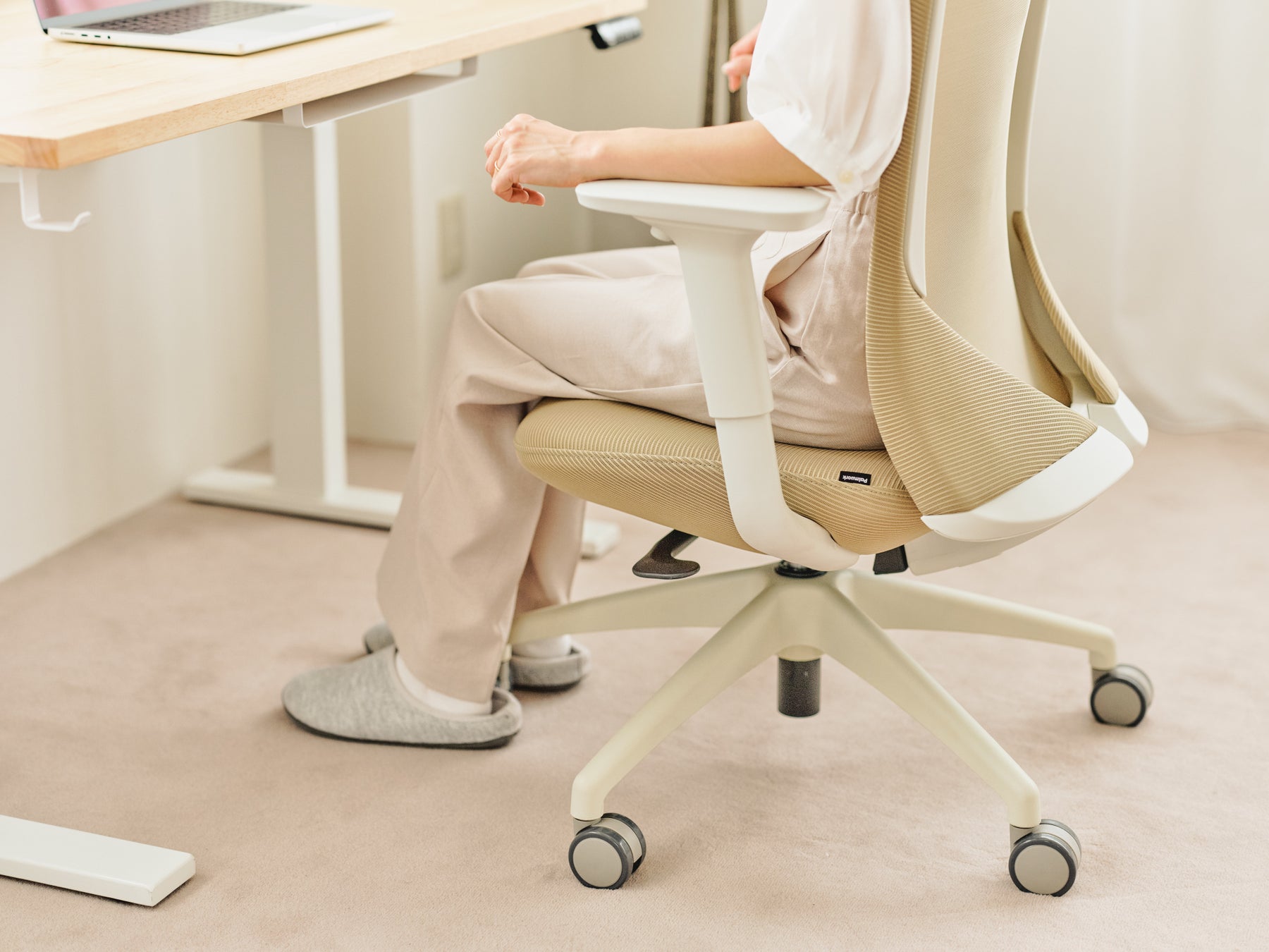 座面が高すぎることによる「地面への足つきの悪さ」は、姿勢の悪化や下半身の血流悪化へつながります。しかし、男性を顧客の中心としてきたオフィスチェアには、座面高がそこまで下がらないものも多く、女性や小柄な方のチェア選びにおける大きな課題となっていました。
