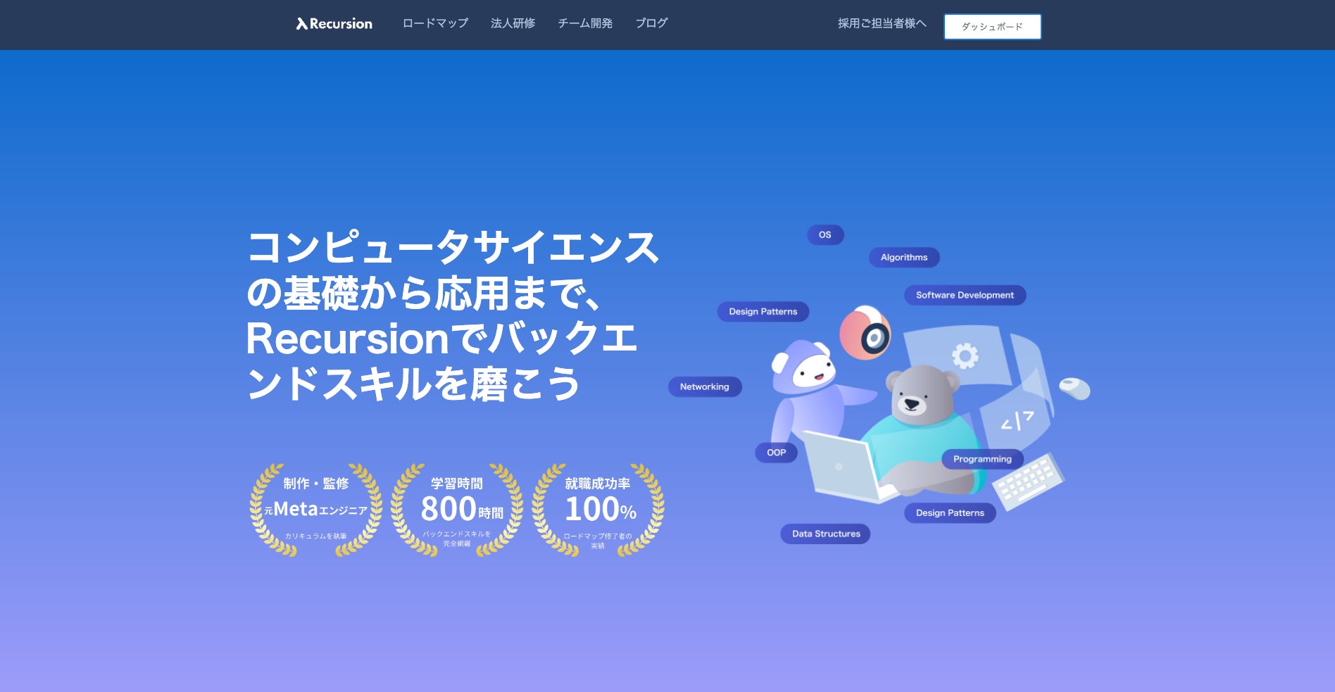 Recursionは、アメリカの大学におけるコンピュータサイエンス課程を参考に、元Metaのソフトウェアエンジニアによって立ち上げられたオンライン学習サービスです。アウトプットを重視した学習設計を採用しており、コンピュータサイエンスの基礎から応用までを体系的かつ効率的に学べる点が特徴です。