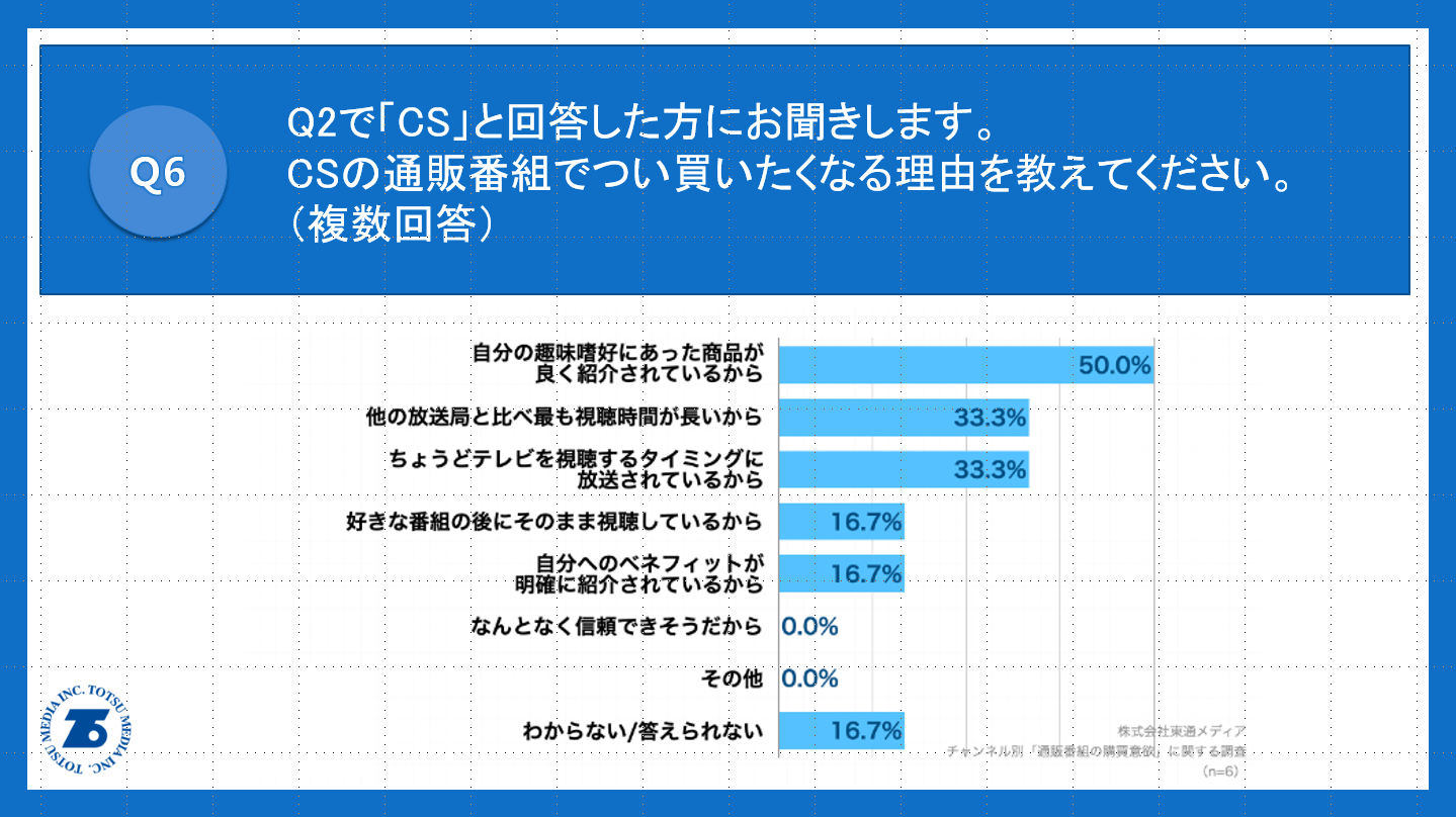 Q2で「CS」と回答した方に、「Q6.CSの通販番組でつい買いたくなる理由を教えてください。(複数回答)」(n=6)と質問したところ、「自分の趣味嗜好にあった商品が良く紹介されているから」が50.0%、「他の放送局と比べ最も視聴時間が長いから」が33.3%、「ちょうどテレビを視聴するタイミングに放送されているから」が33.3%という回答となりました。