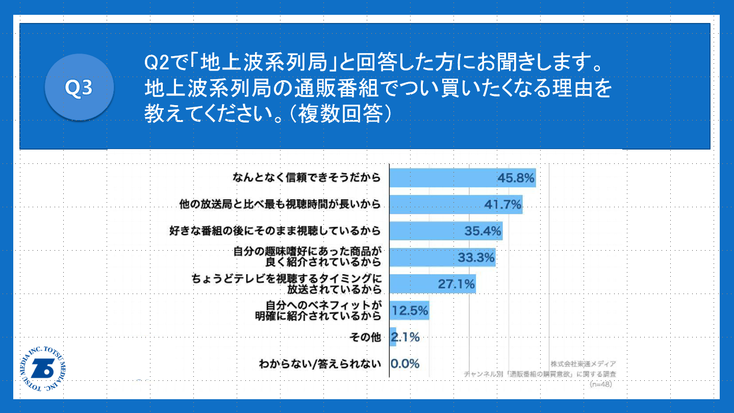 Q2で「地上波系列局」と回答した方に、「Q3.地上波系列局の通販番組でつい買いたくなる理由を教えてください。(複数回答)」(n=48)と質問したところ、「なんとなく信頼できそうだから」が45.8%、「他の放送局と比べ最も視聴時間が長いから」が41.7%、「好きな番組の後にそのまま視聴しているから」が35.4%という回答となりました。