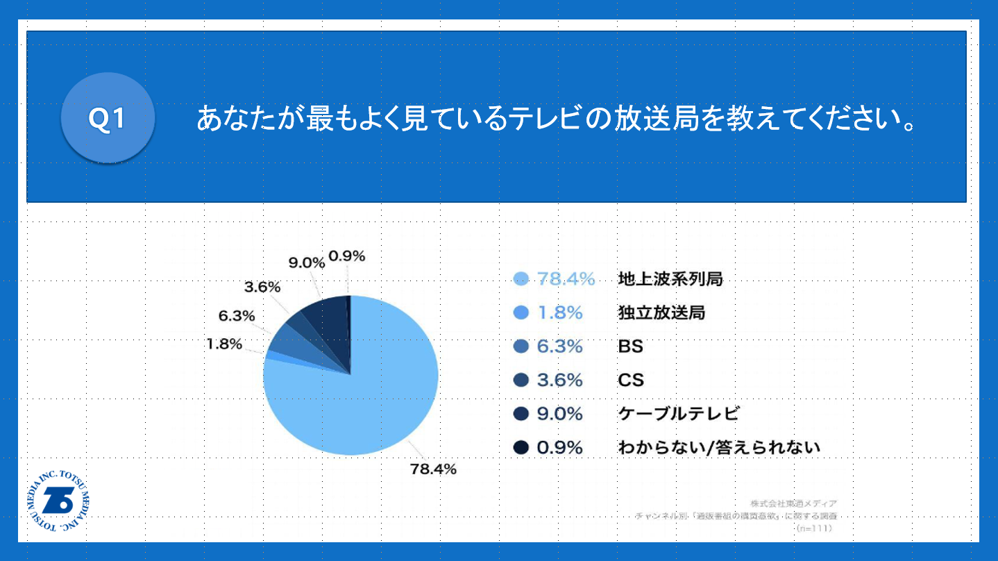 「Q1.あなたが、最もよく見ているテレビの放送局を教えてください。」(n=111)と質問したところ、「地上波系列局」が78.4%、「独立放送局」が1.8%という回答となりました。