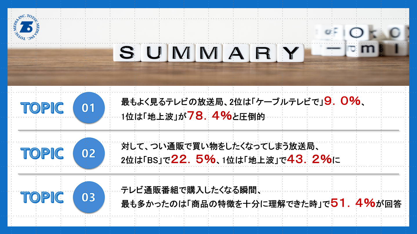 最も視聴するテレビの放送局は、ほとんどが「地上波」で回答する方が多かった事に対し、つい買いたくなるようなテレビ通販番組を放送している放送局となると、「地上波」だけではなく、「BS」も上位に挙がっていることが明らかになりました。半数以上が、「商品の特徴を十分に理解できた時」にテレビ通販番組で商品を購入したくなると回答しており、一方で「商品にメリットを感じられなかった」や「インターネット通販のほうが安かった」となると、テレビ通販番組では商品を購入しない判断をする方がいるようです。