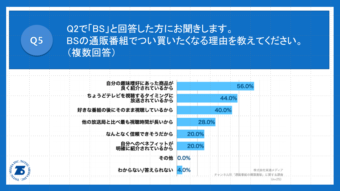 Q2で「BS」と回答した方に、「Q5.BSの通販番組でつい買いたくなる理由を教えてください。(複数回答)」(n=25)と質問したところ、「自分の趣味嗜好にあった商品が良く紹介されているから」が56.0%、「ちょうどテレビを視聴するタイミングに放送されているから」が44.0%、「好きな番組の後にそのまま視聴しているから」が40.0%という回答となりました。