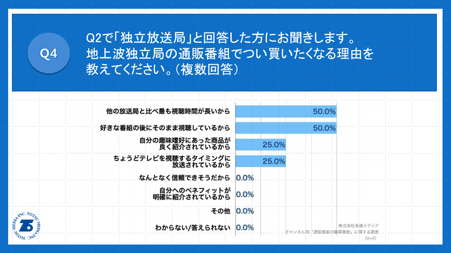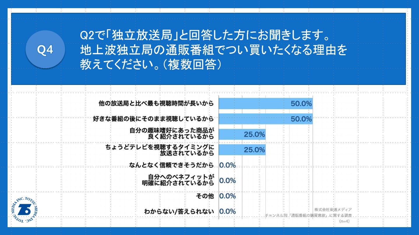 Q2で「独立放送局」と回答した方に、「Q4.地上波独立局の通販番組でつい買いたくなる理由を教えてください。(複数回答)」(n=4)と質問したところ、「他の放送局と比べ最も視聴時間が長いから」が50.0%、「好きな番組の後にそのまま視聴しているから」が50.0%、「自分の趣味嗜好にあった商品が良く紹介されているから」が25.0%という回答となりました。