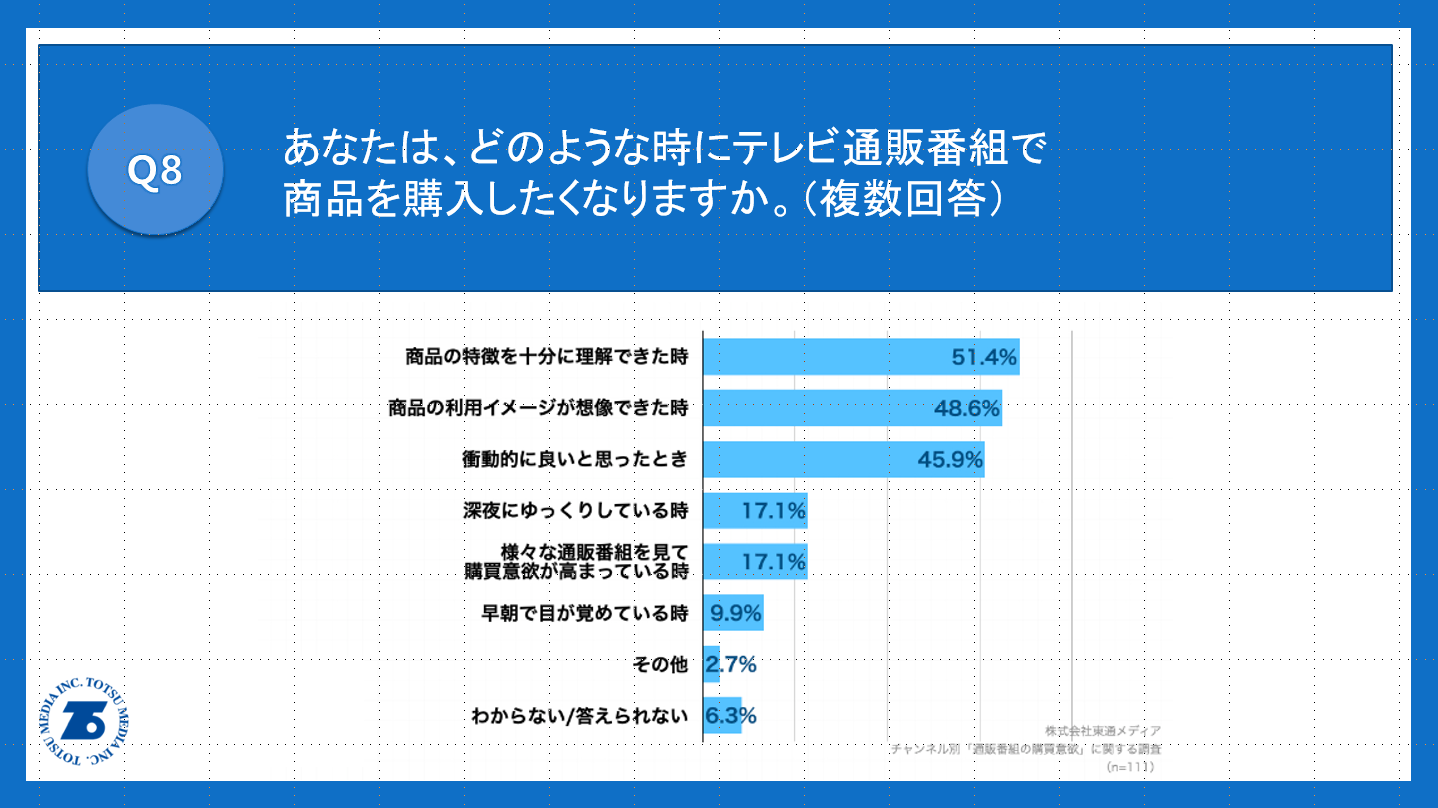 「Q8.あなたは、どのような時にテレビ通販番組で商品を購入したくなりますか。(複数回答)」(n=111)と質問したところ、「商品の特徴を十分に理解できた時」が51.4%、「商品の利用イメージが想像できた時」が48.6%、「衝動的に良いと思ったとき」が45.9%という回答となりました。