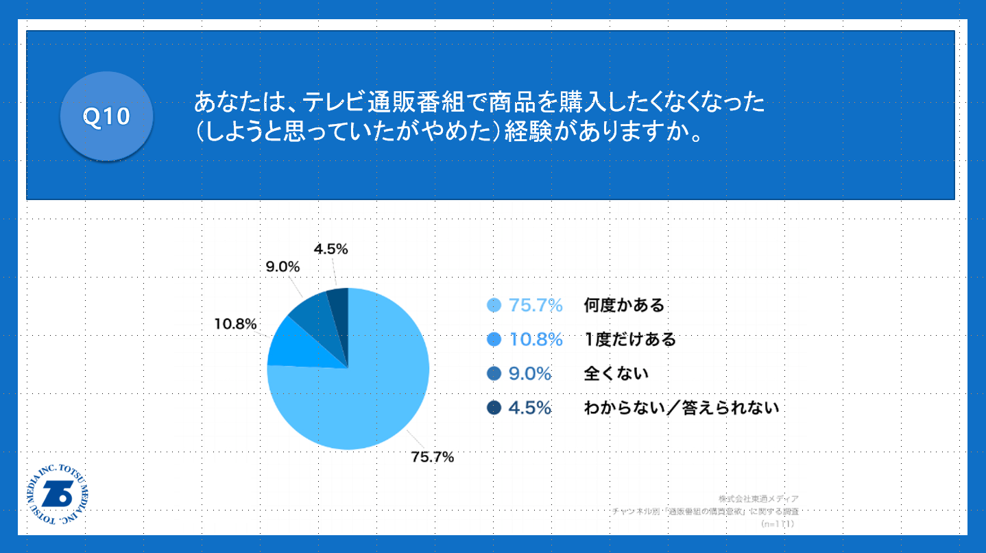 「Q10.あなたは、テレビ通販番組で商品を購入したくなくなった(しようと思っていたがやめた)経験がありますか。」(n=111)と質問したところ、「何度かある」が75.7%、「1度だけある」が10.8%という回答となりました。