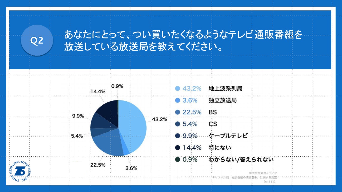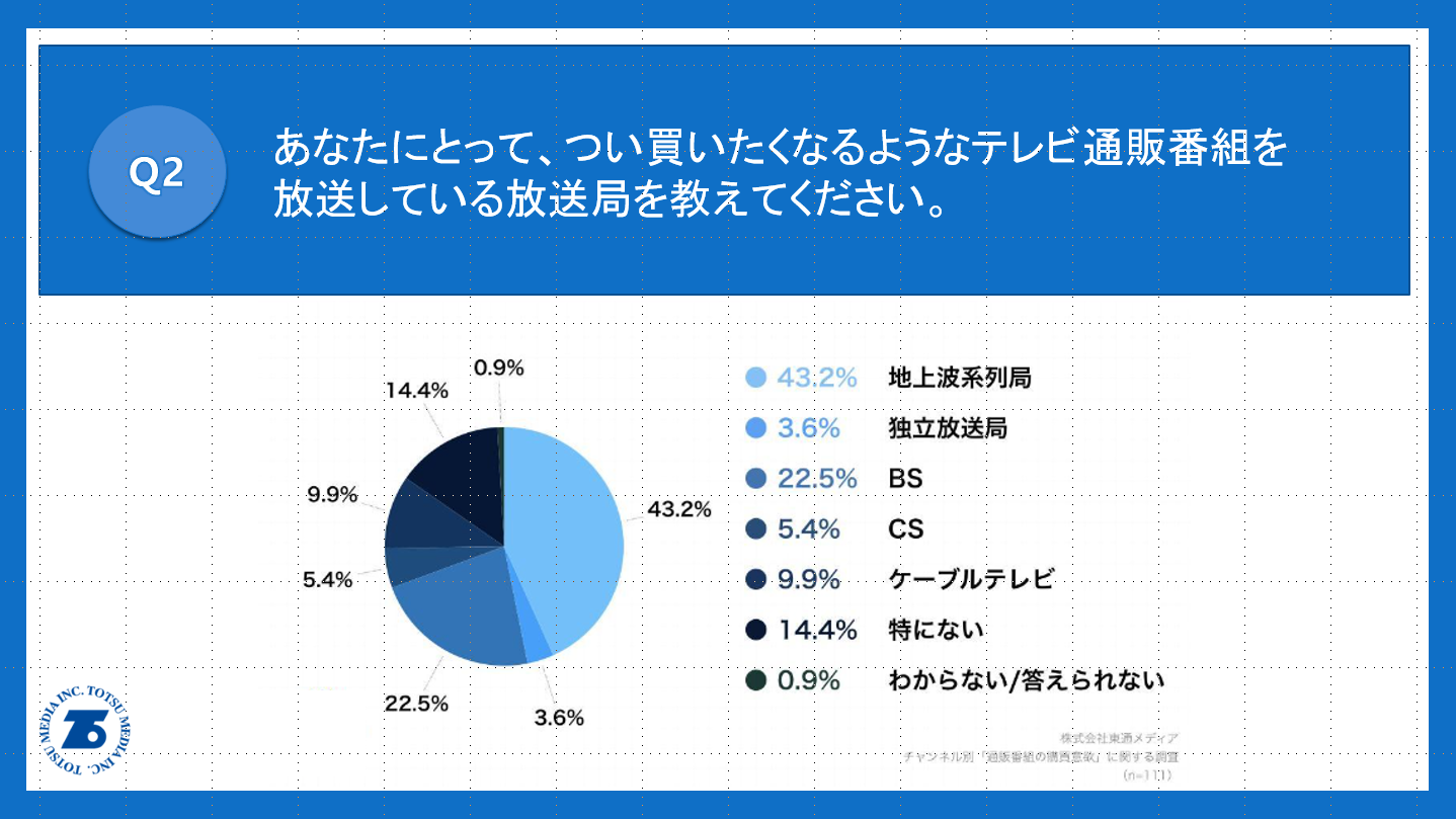 「Q2.あなたにとって、つい買いたくなるようなテレビ通販番組を放送している放送局を教えてください。」(n=111)と質問したところ、「地上波系列局」が43.2%、「独立放送局」が3.6%という回答となりました。