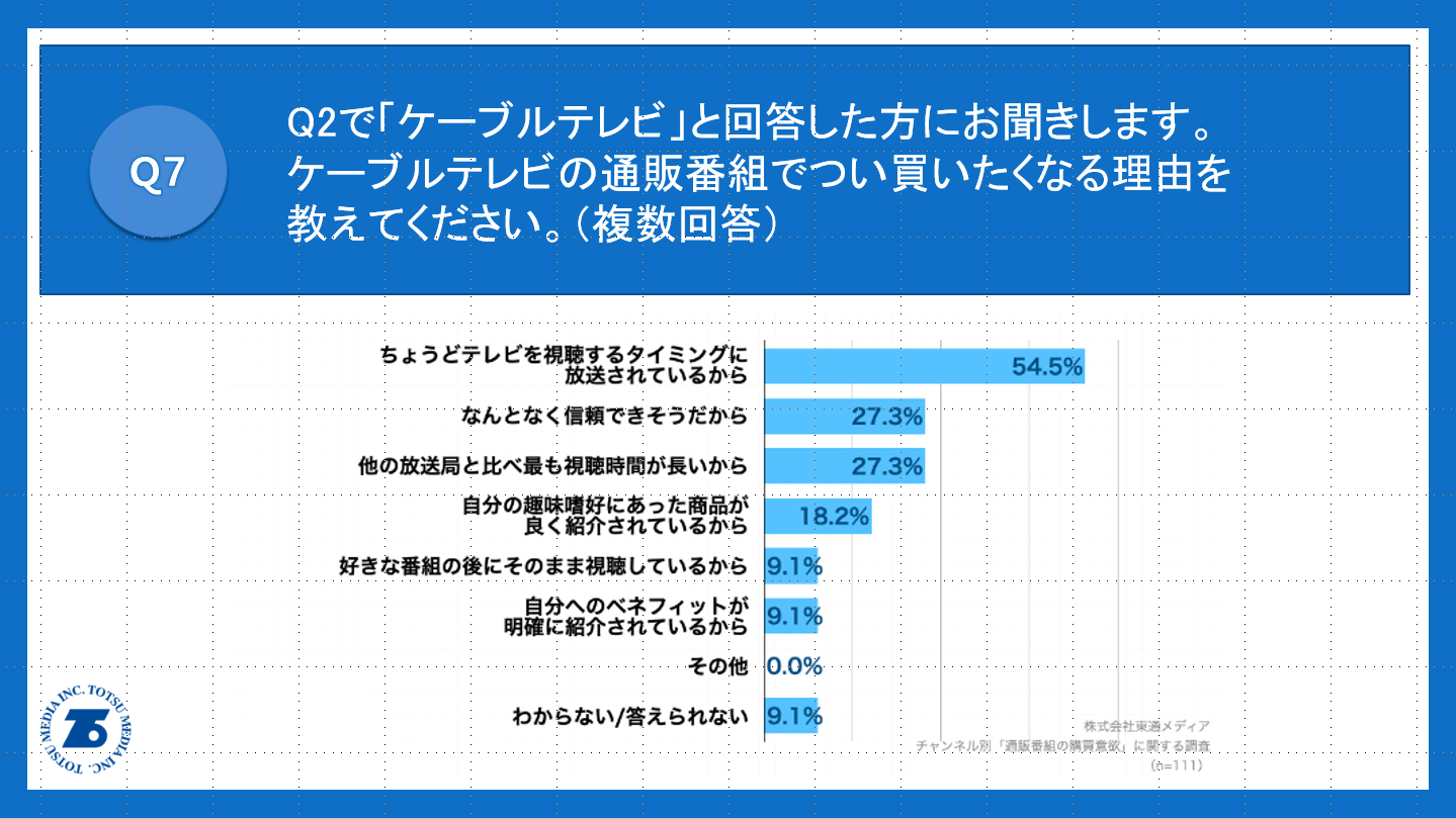 Q2で「ケーブルテレビ」と回答した方に、「Q7.ケーブルテレビの通販番組でつい買いたくなる理由を教えてください。(複数回答)」(n=11)と質問したところ、「ちょうどテレビを視聴するタイミングに放送されているから」が54.5%、「なんとなく信頼できそうだから」が27.3%、「他の放送局と比べ最も視聴時間が長いから」が27.3%という回答となりました。