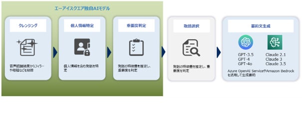 音声認識テキストに対して重要度判定やクレンジング、個人情報特定を自動で行い、生成AI利用前に文章を自動で正規化します。