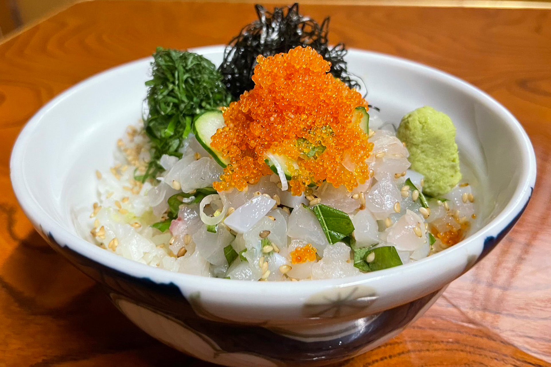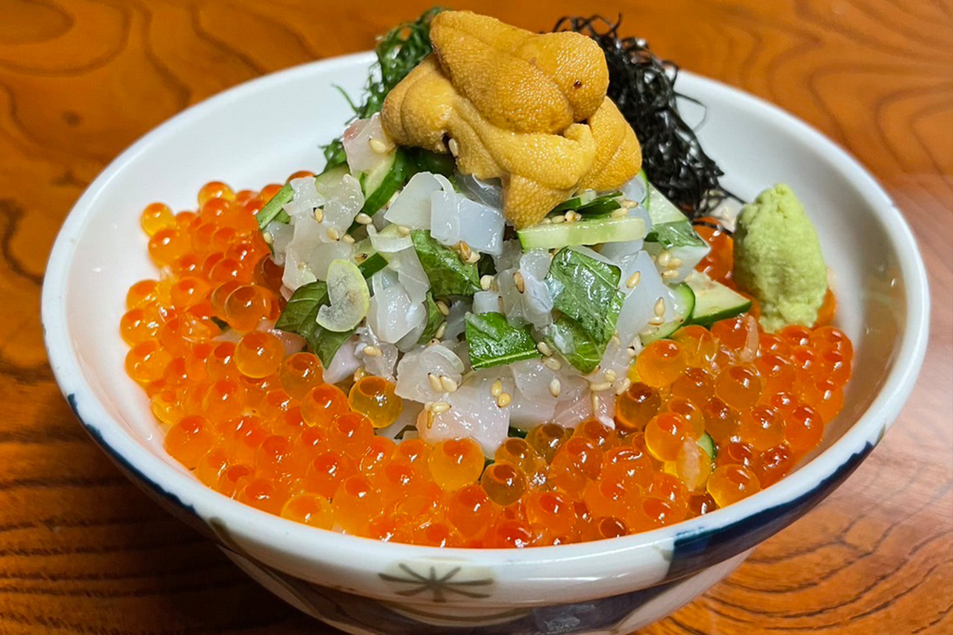 長年看板メニューとなってきた「うにめし」は壱岐島の海女さんが採った「紫ウニ」「赤ウニ」「バフンウニ」の3種類を混ぜ込んだ贅沢な炊き込みご飯。うにの香りが優しく広がる味わい深い一品です。新鮮なお刺身と一緒に、壱岐の豊かな海の幸をご賞味ください。