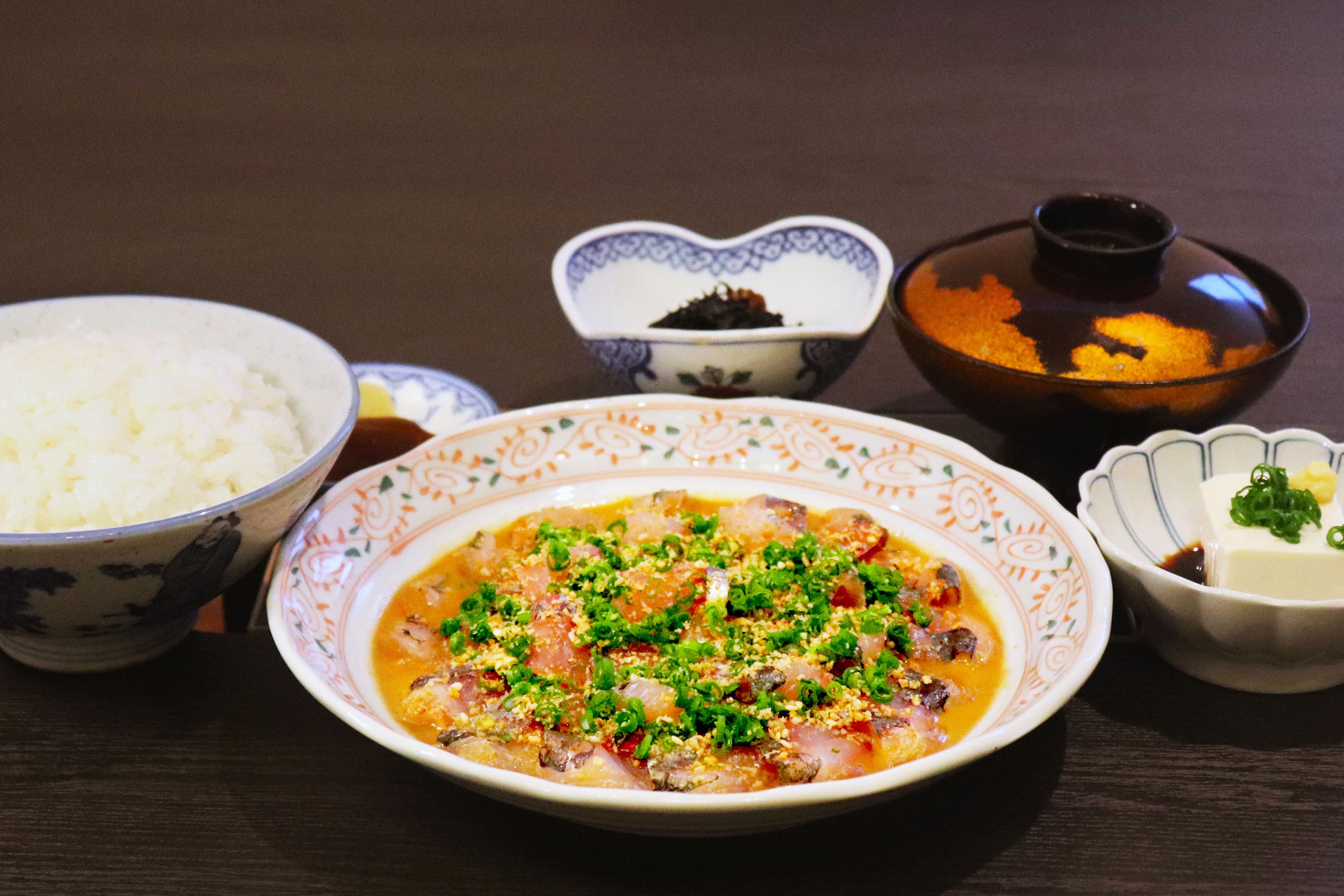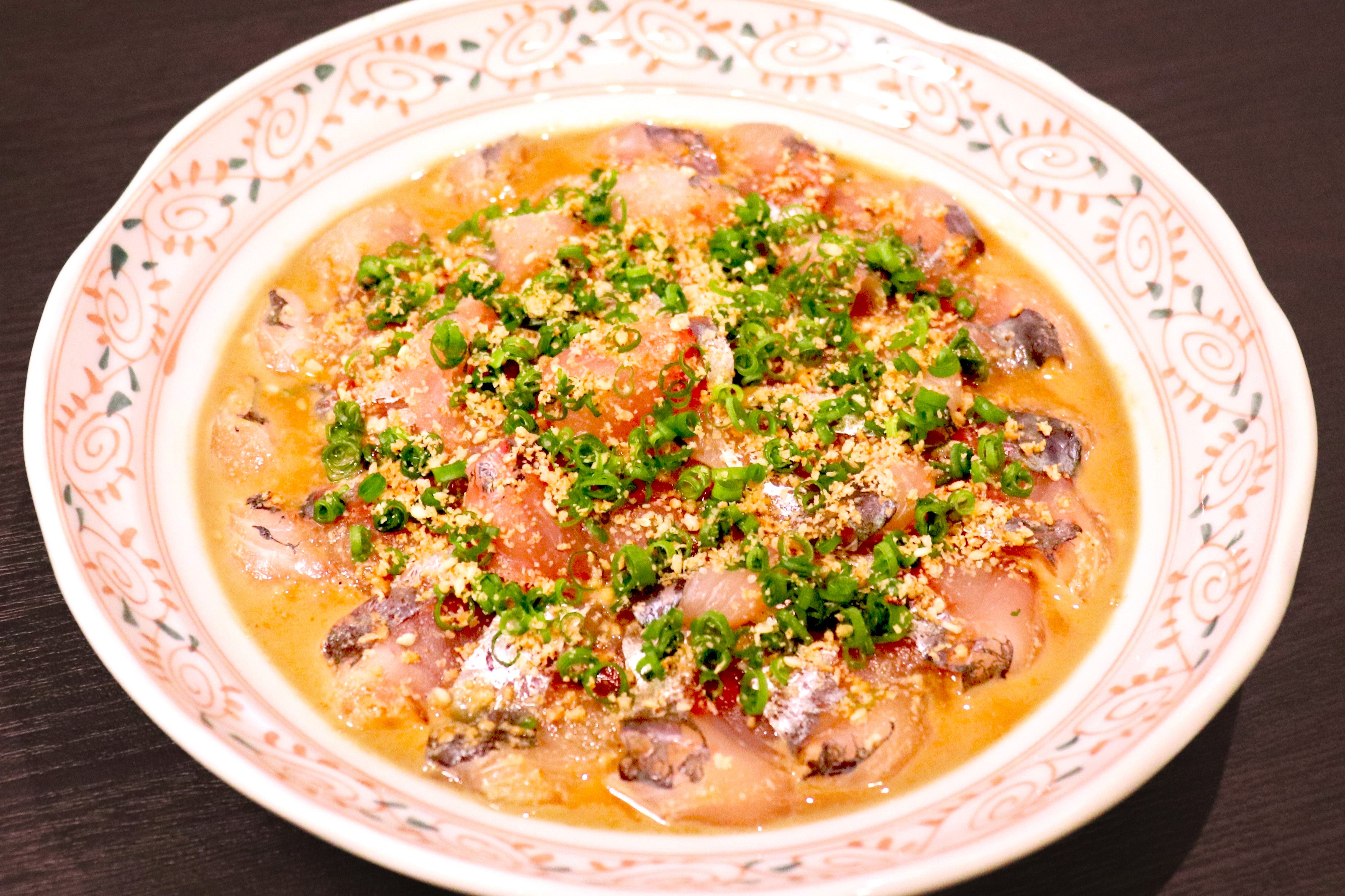 サバの代わりに壱岐の新鮮なアジの刺身でお作りしています。濃厚なゴマだれが絡む歯ごたえ抜群の一品は、ご飯ともお酒とも合う最高の一品です。