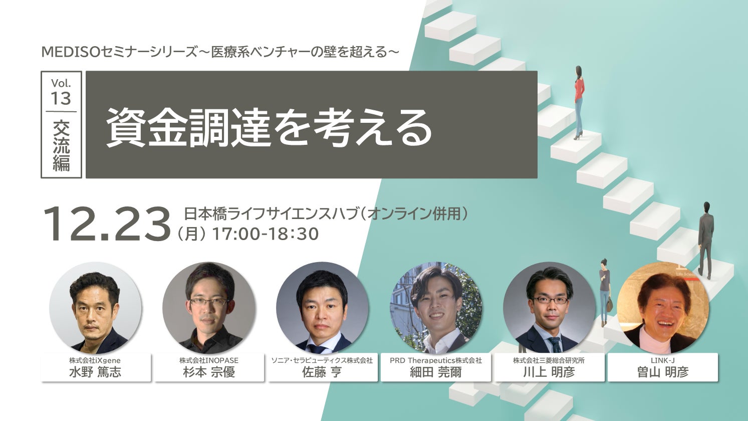 第13回MEDISOセミナーでは、資金調達をテーマとして、株式会社iXgene水野様・株式会社INOPASE杉本様・ソニア・セラピューティクス株式会社佐藤様・PRD Therapeutics株式会社細田様より、資金調達の戦略や準備、投資側とのコミュニケーション等、ご経験をご紹介いただきます。また、ご参加の皆様から頂いたご質問も交えながら、資金調達に取り組む中で生じる課題等についてパネルディスカッションします。また、後半には会場限定のプログラムも予定しています。