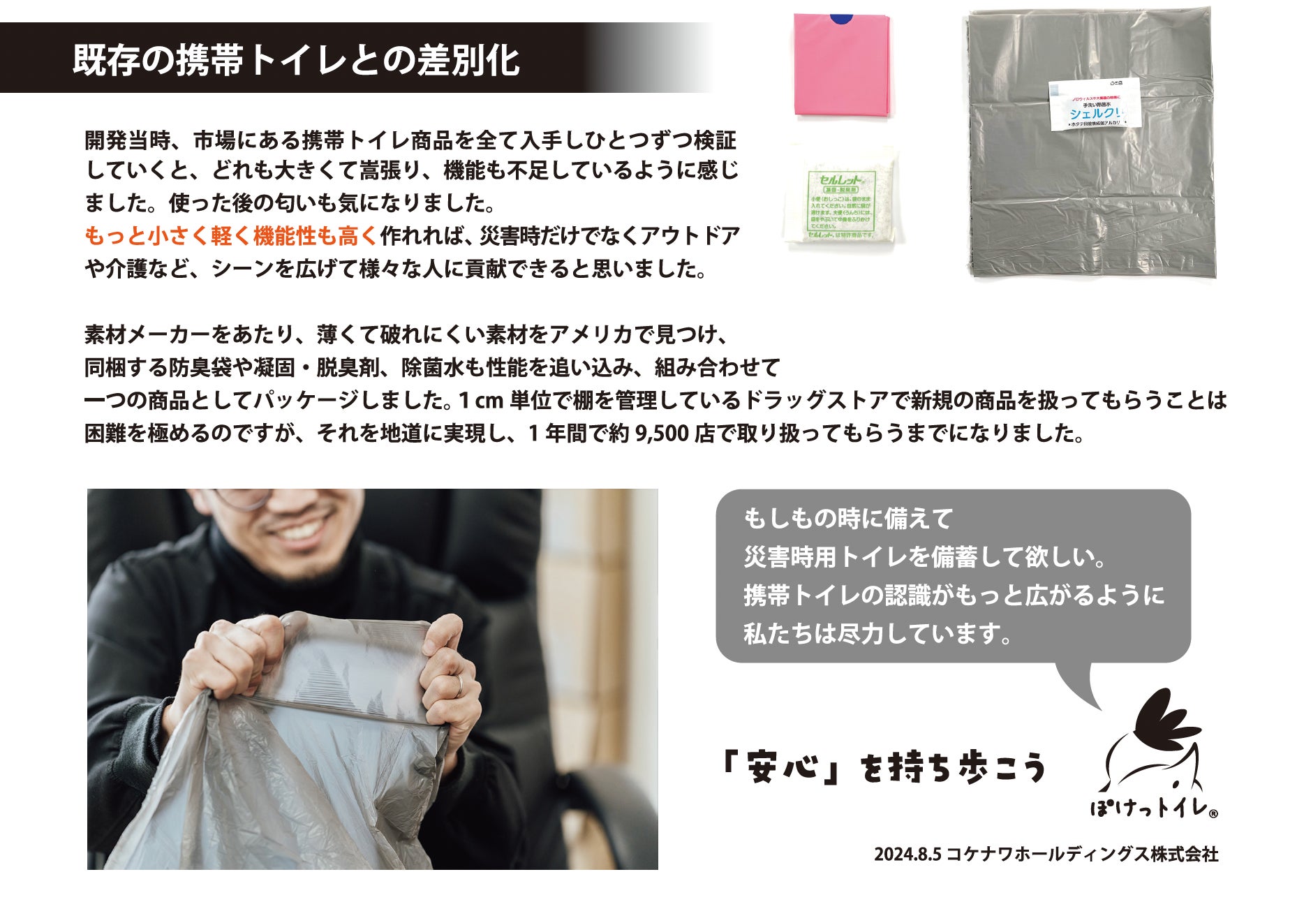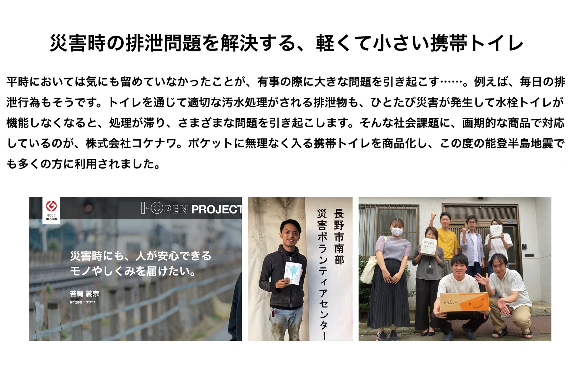 私たちは、災害大国と呼ばれる日本ですら "十分な危機意識と備えが行われていない状況" に危機感を抱き、防災用品を開発・販売を2年前に始めました。能登半島地震などの被災地に留まらず、アウトドア用品・介護用品でも大好評となり、今では全国各地のドラッグストア約1万店舗で取扱されています。