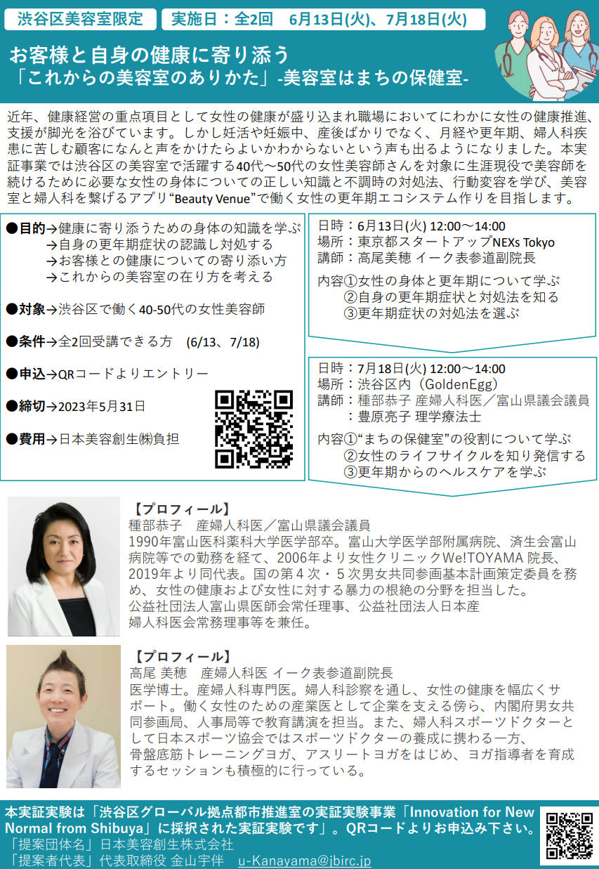 そこで本実証では、多くの女性が利用する美容室において、将来的に美容室が女性の美容だけでなく気軽に健康相談できる場となることを目的に美容室で働く40代~50代の女性美容師を対象に2つのテーマ『①美容師への事業啓蒙』『②美容師による事業実践』を1年通じてヘルスリテラシー研修会と美容業界の新しい認定制度の検証を行います。