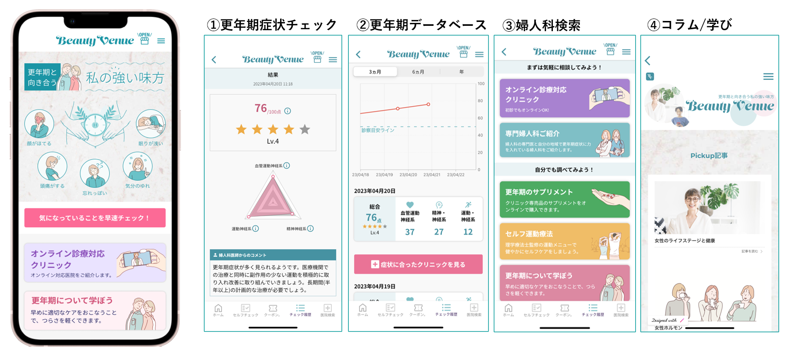 更年期を迎える女性と婦人科を繋げるアプリです。更年期症状の進行を簡略化更年期指数(SMI)でセルフチェックでき、その結果に応じた各ソリューションが提示されます。ユーザーは地域で対面診療できる婦人科を探すだけでなく、またオンライン診療の婦人科も見つけることができます。